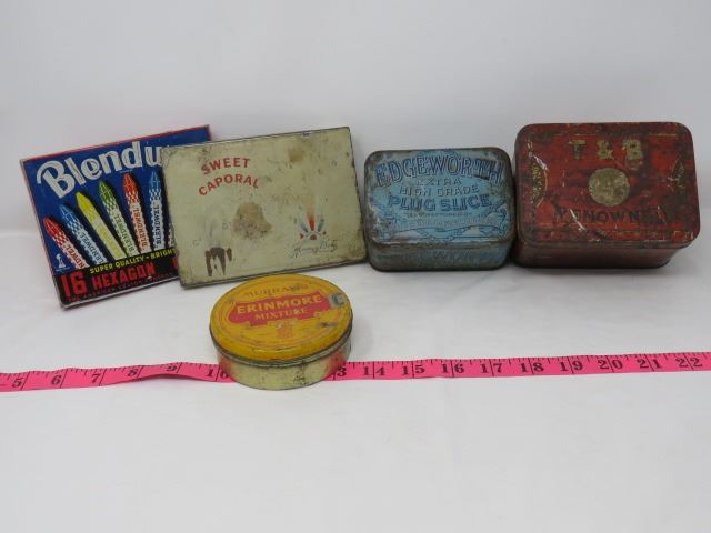 5 TOBACCO TINS, EDGEWORTH, T&B, RENOWNED, ERINMORE, SWEET CORPORAL, 1 BLENDWEL CRAYON BOX