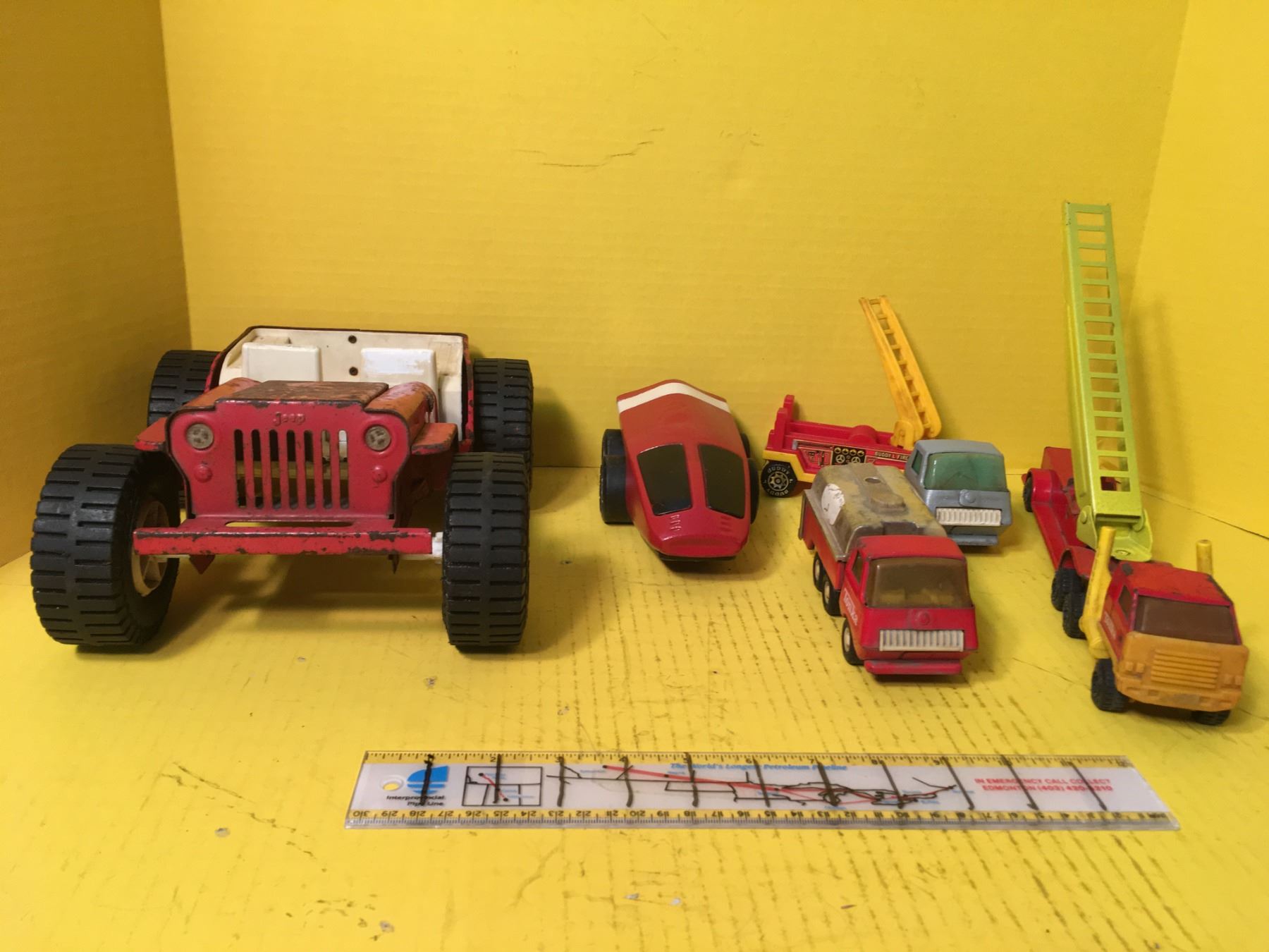 TONKA FIRE TRUCK, TONKA TRUCK & BUDDY L LADDER, TONKA FUEL TRUCK, TONKA JEEP - AS IS, RACER