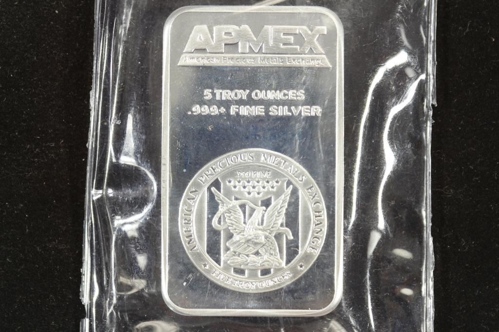 5 TROY OZ. .999 PLUS FINE SILVER BAR APMEX
