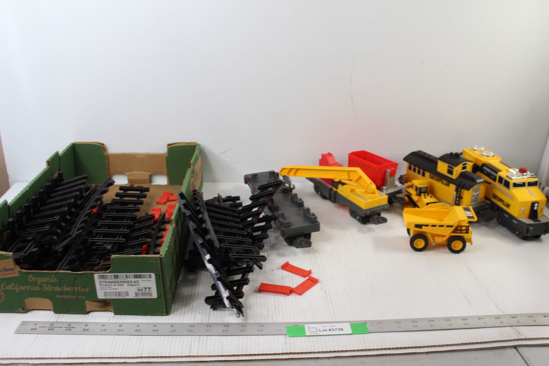 (5) Toy Trains, Toy Dump Truck and Bulldozer, Assorted Train Tracks