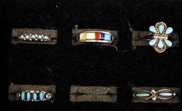 5 Traditional Zuni Rings Sz 4.5''-9''. There is one size 4.5, 2-6.5, 1-8, & 1-9. Rings weigh 8.12gr. Included are petit point, sterling silver channel inlay and needle point.