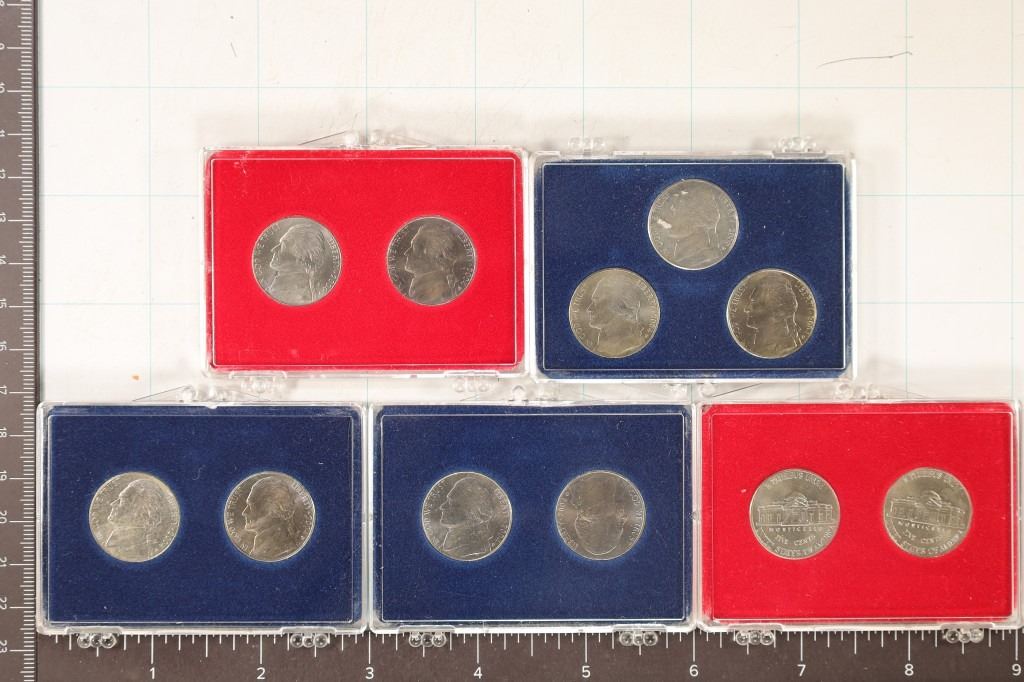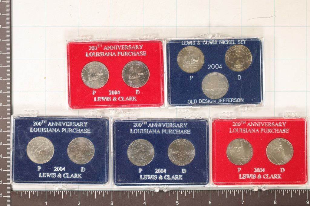JEFFERSON NICKEL, 2-2004-P & D PEACE NICKEL , 1-2004-P & D KEELBOAT AND ONE SET WITH 2004-P KEELBOAT, 2004-D PEACE NICKEL AND 2000-D JEFFERSON NICKEL. ALL IN HARD PLASTIC CAPSULE