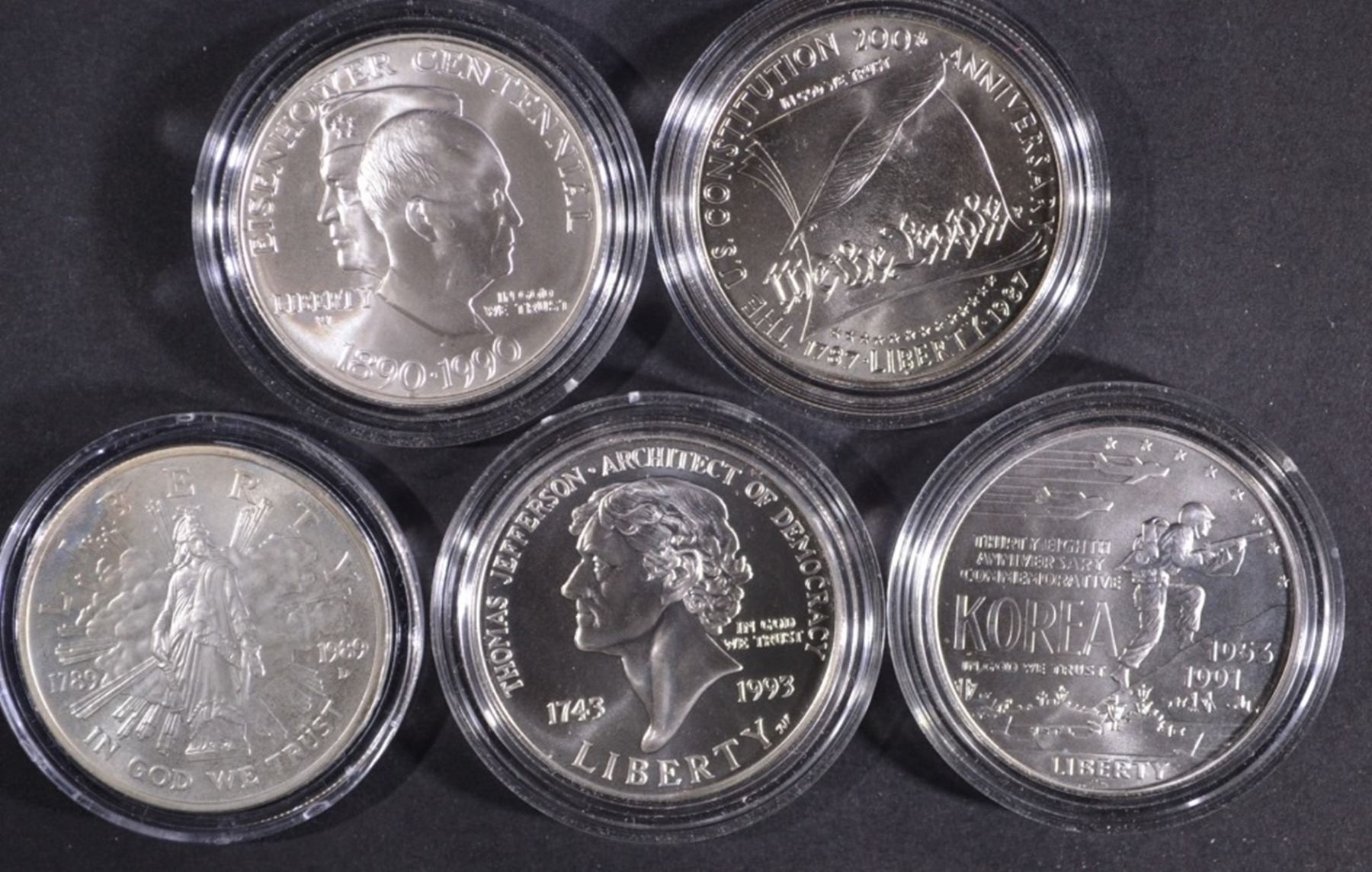 1987 P CONSTITUTION, 1989 D CONGRESSIONAL, 1990 W EISENHOWER, 1993 D WWII, 1993 P THOMAS JEFFERSON. ESTIMATE $155 - $165.