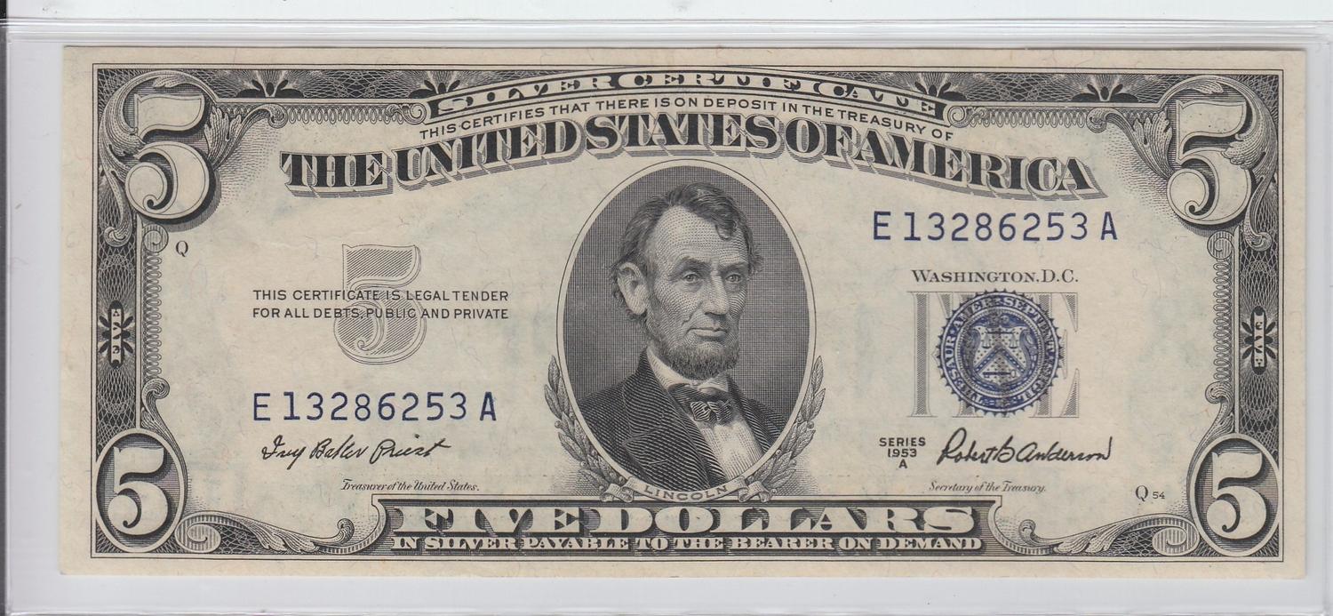 $5 UNCIRCULATED SILVER CERTIFICATE 1953 SHARP APPEAL