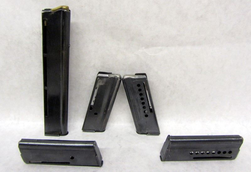 FOUR MATCHING MAGAZINES, POSSIBLY FOR A PISTOL. ONE HIGH-CAPACITY MAGAZINE, POSSIBLY FOR GEVARM RIFLE.