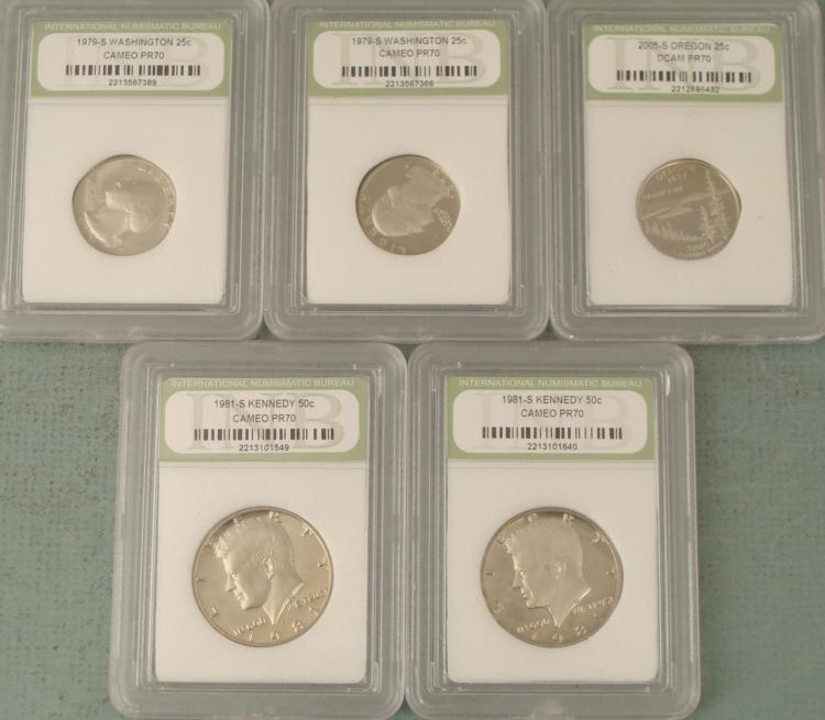 5 U.S. Slabbed coins 2005-S Oregon Quarter, DCAM (2) 1979-S Quarters, Cameo (2) 1981-S Halves, Cameo Grade: All are PR 70 For International shipping please request a SHIPPING QUOTE Shipping and handling for this item is $6.95 plus additional insurance cost. The approximate shipping weight of this items is 1 oz. - 1 lb... For more information please see our shipping table by weight on our aboutme page . See over 2,000 art, antique & collectible items on our eBay Store, by clicking here! Like this item? See similar ebay items by clicking here! CLICK THE IMAGE TO ENLARGE Listed with Midwest Estate Buyer's Auction Management System ™ AMS™