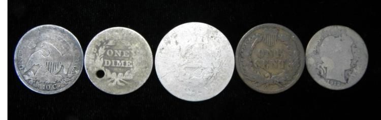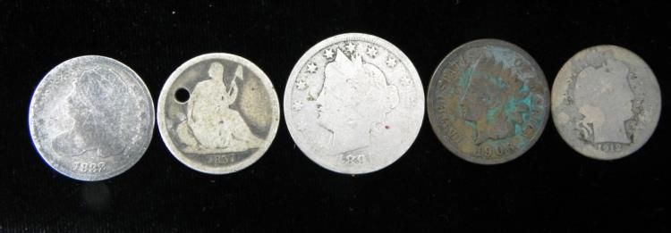 Offered are 5 US Type Coins. They are:1832 - Capped Bust Dime--1851 - Seated Liberty Dime (Holed)--1912 - Barber Dime--1885 - V. Nickel--1906 - Indian Cent