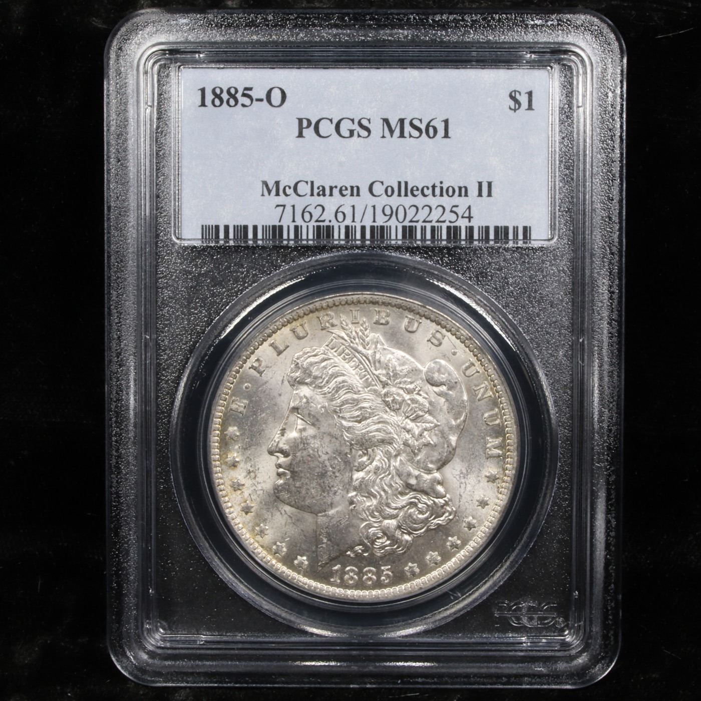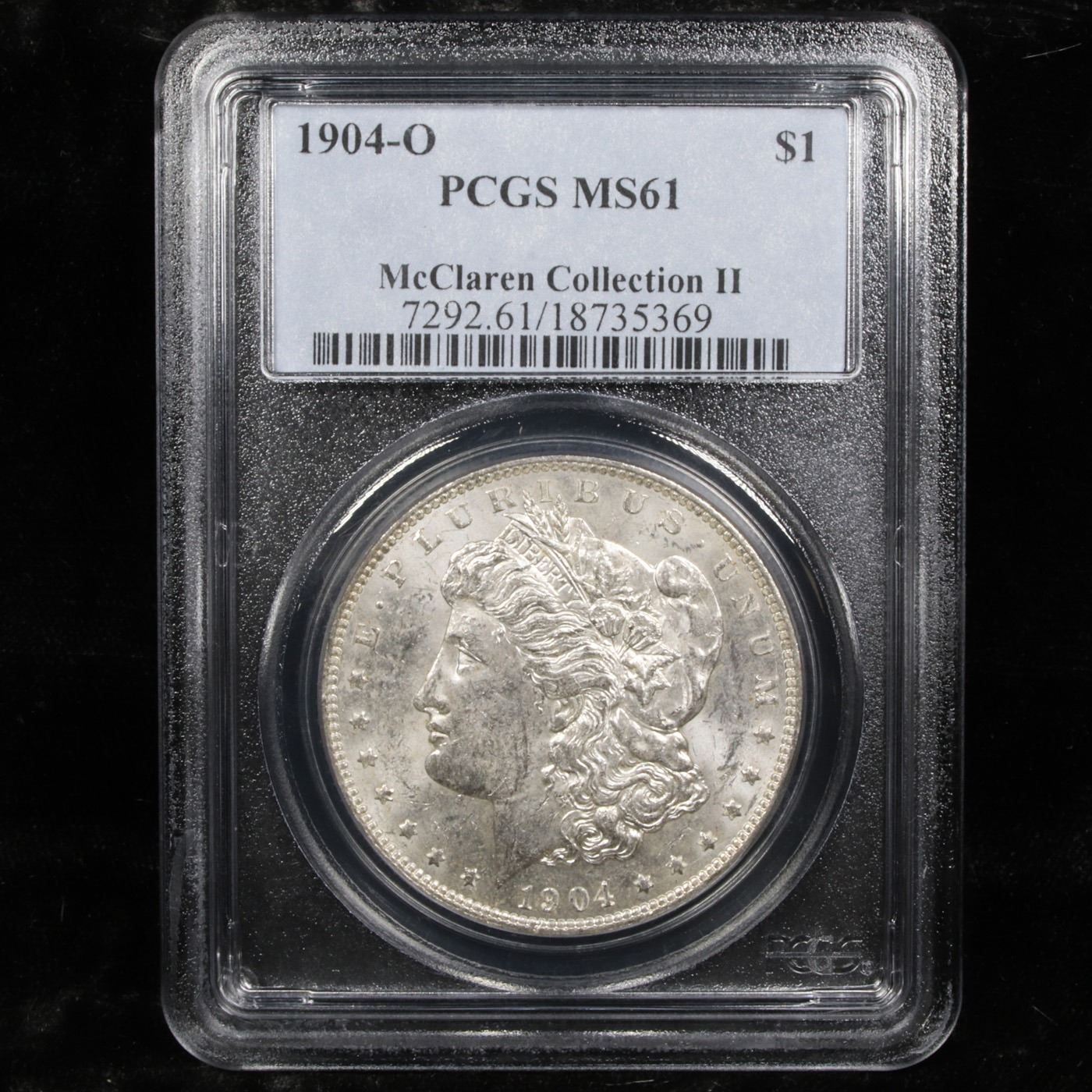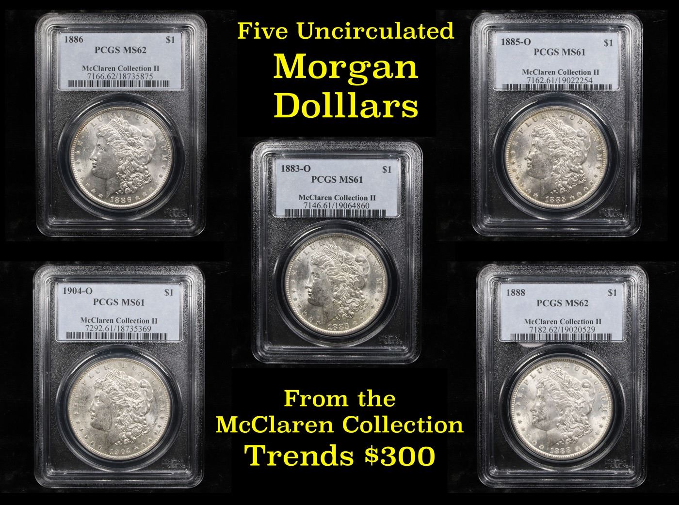 5 Unc Morgan $1 Graded By PCGS Mixed Dates From The McClaren Collection Grades. 1904-o $1 MS61 By PCGS, 1883-o $1 ms61 By PCGS, 1886-p $1 ms61 By PCGS, 1885-o $1 MS61 By PCGS, 1888-p $1 ms61 By PCGS, Estimate $300 ,****Please Note you will Revieve exact slabs pictured in lot