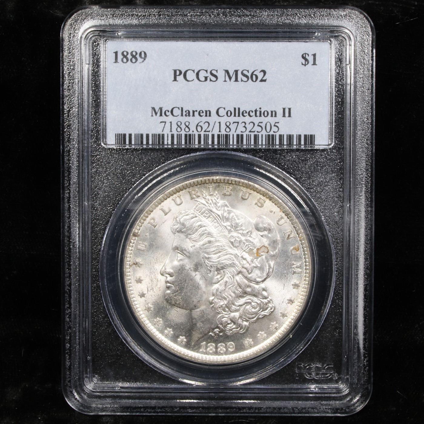 5 Unc Morgan $1 Graded By PCGS Mixed Dates From The McClaren Collection Grades. 1884-o $1 MS61 By PCGS, 1889-p $1 ms62 By PCGS, 1883-o $1 ms61 By PCGS, 1885-o $1 MS61 By PCGS, 1904-o $1 ms61 By PCGS, Estimate $300 ,****Please Note you will Revieve exact slabs pictured in lot