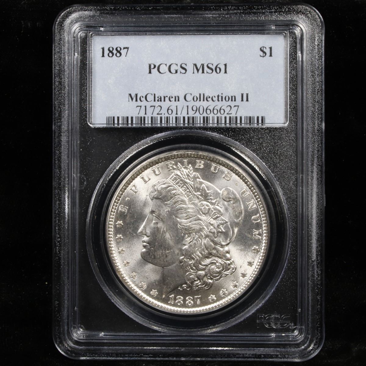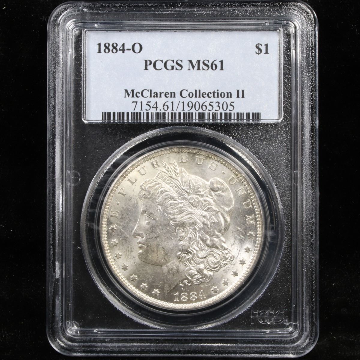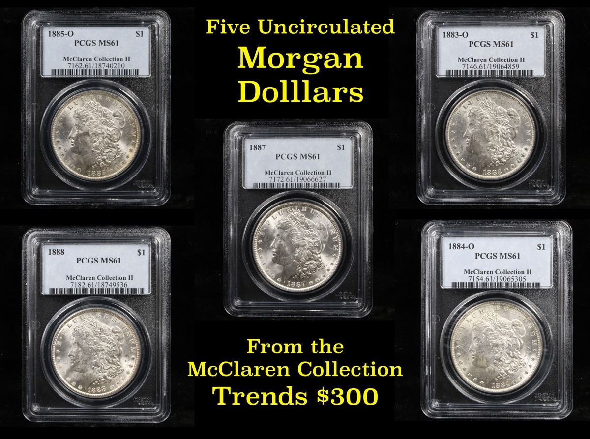 5 Unc Morgan $1 Graded By PCGS Mixed Dates From The McClaren Collection. 1884-o $1 MS61 By PCGS, 1883-o $1 ms61 By PCGS, 1888-p $1 ms61 By PCGS, 1885-o $1 MS61 By PCGS, 1887-p $1 ms61 By PCGS, Estimate $300 ,****Please Note you will Receive the exact slabs pictured in lot