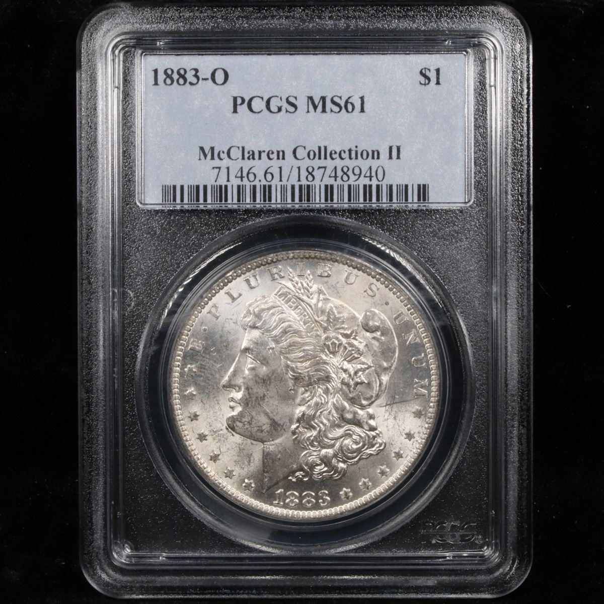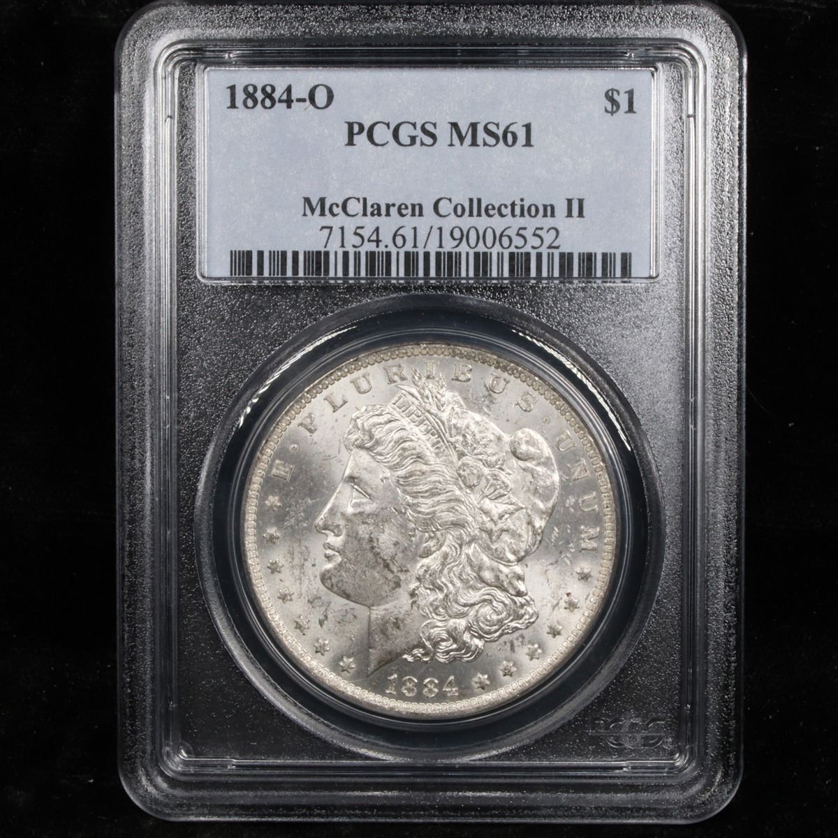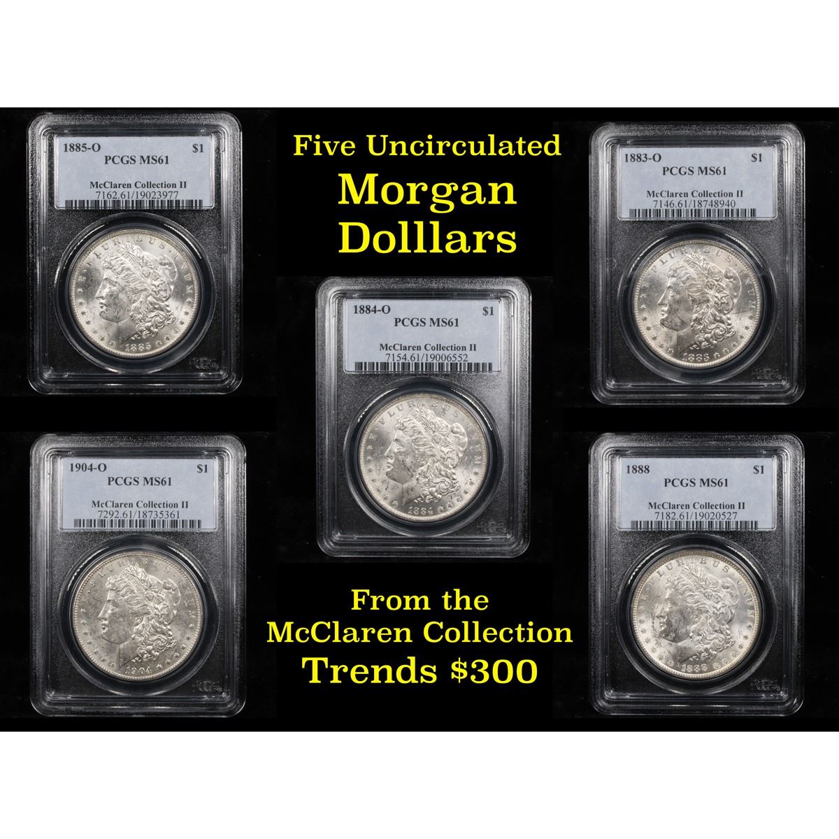 5 Unc Morgan $1 Graded By PCGS Mixed Dates From The McClaren Collection. 1884-o $1 MS61 By PCGS, 1883-o $1 ms61 By PCGS, 1888-p $1 ms61 By PCGS, 1904-o $1 MS61 By PCGS, 1885-o $1 ms61 By PCGS, Estimate $300 ,****Please Note you will Revieve exact slabs pictured in lot