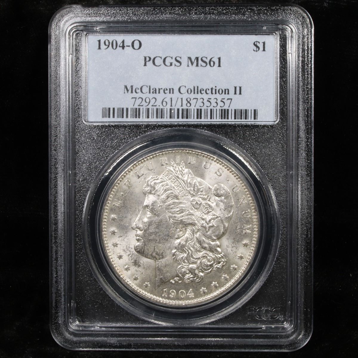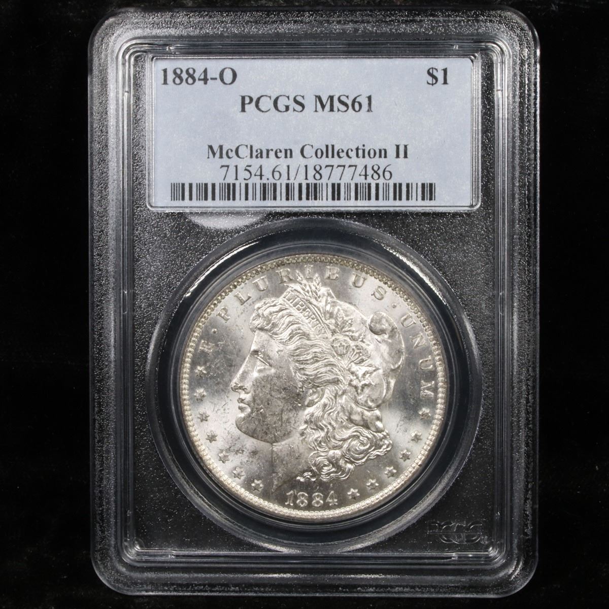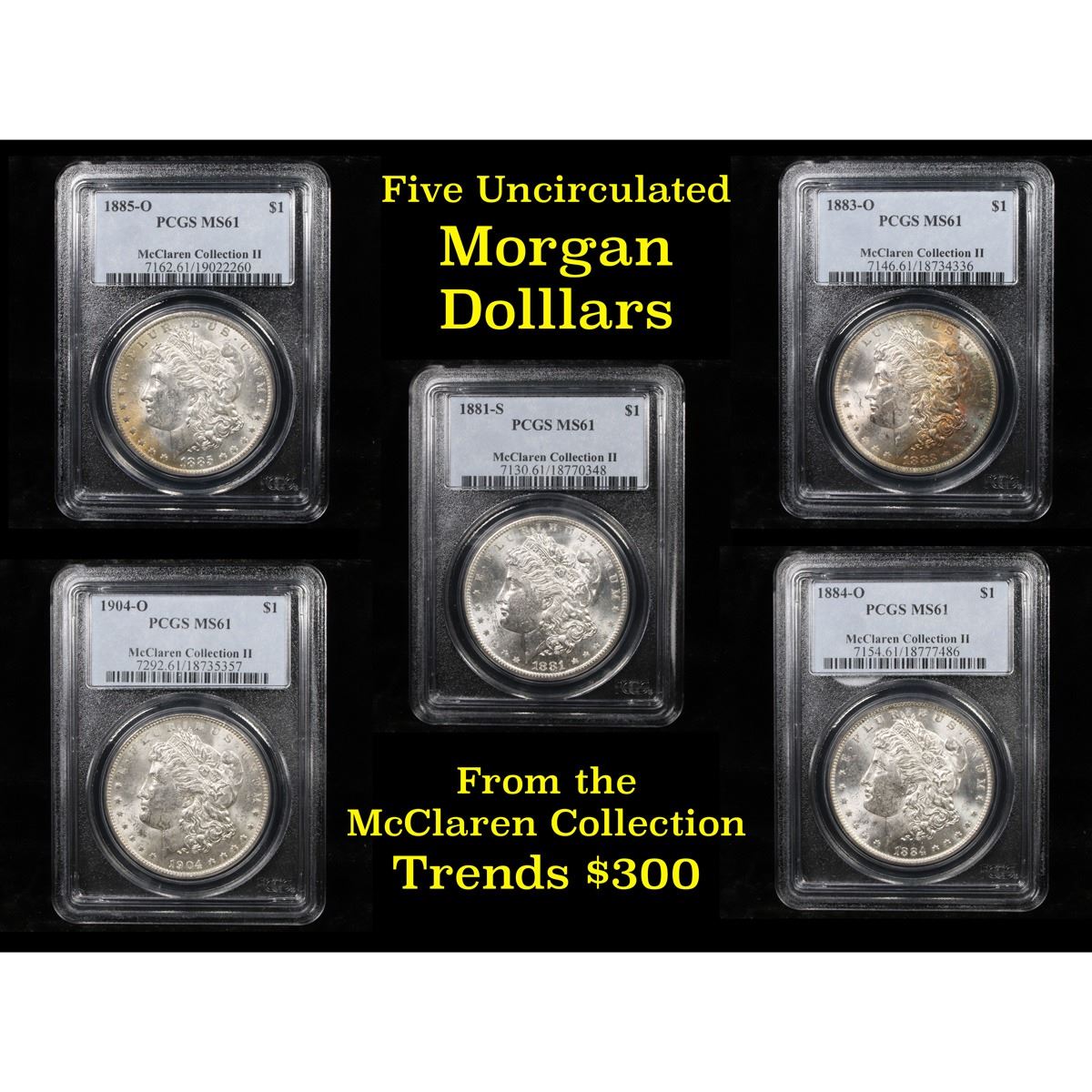 5 Unc Morgan $1 Graded By PCGS Mixed Dates From The McClaren Collection. 1884-o $1 MS61 By PCGS, 1883-o $1 ms61 By PCGS, 1881-s $1 ms61 By PCGS, 1885-o $1 MS61 By PCGS, 1904-o $1 ms61 By PCGS, Estimate $300 ,****Please Note you will Revieve exact slabs pictured in lot