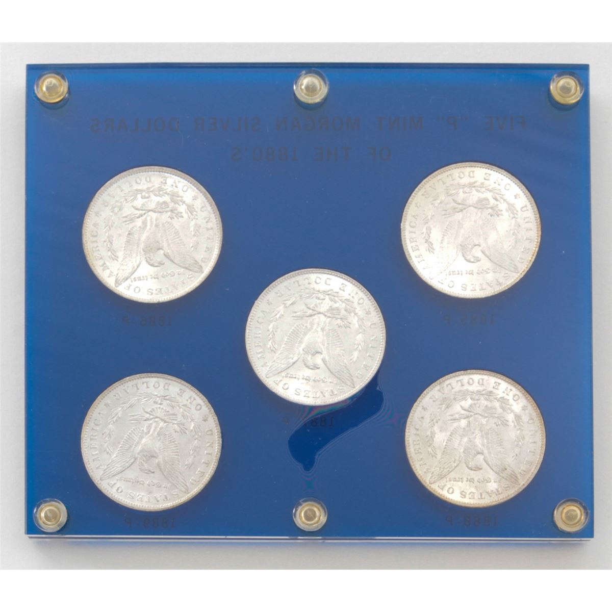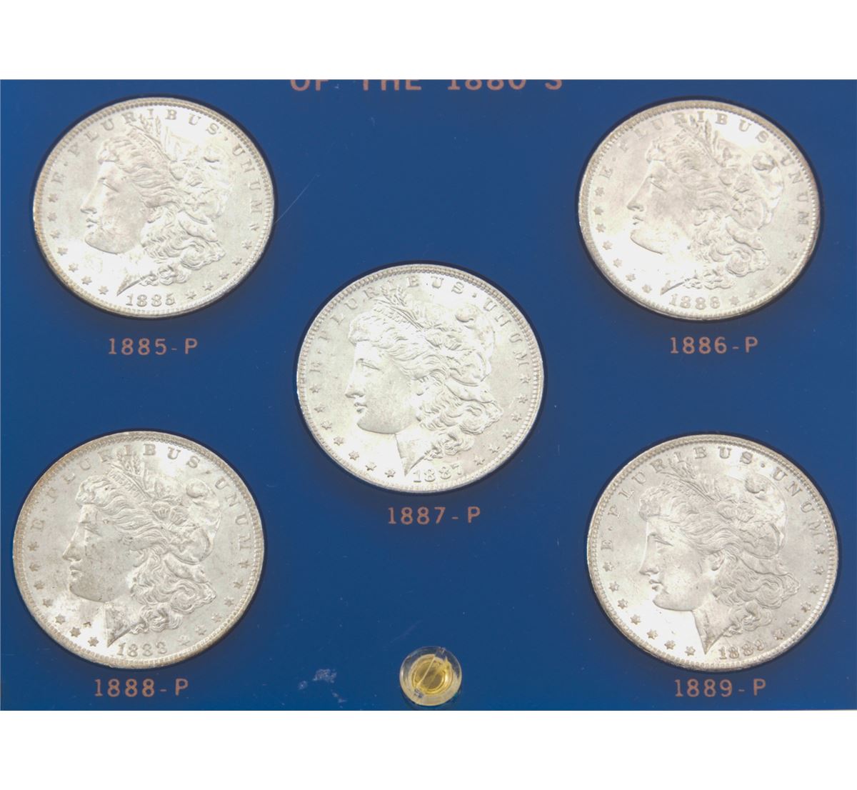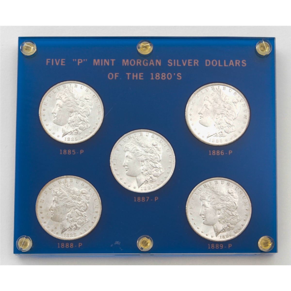 Five (5) Uncirculated ''P'' Mint Morgan Silver Dollars of the 1880s: 1885-P, 1886-P, 1887-P, 1888-P, 1889-P, in plastic display and box. All are in excellent condition with only very slight toning to edges. Est.: $150-$250/set.