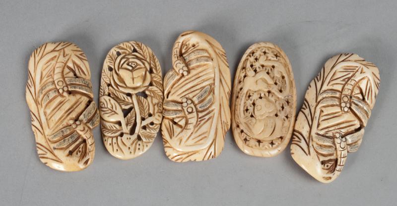 Five bone carvings depicting flowers, insects and animal figures. Largest 3" L.