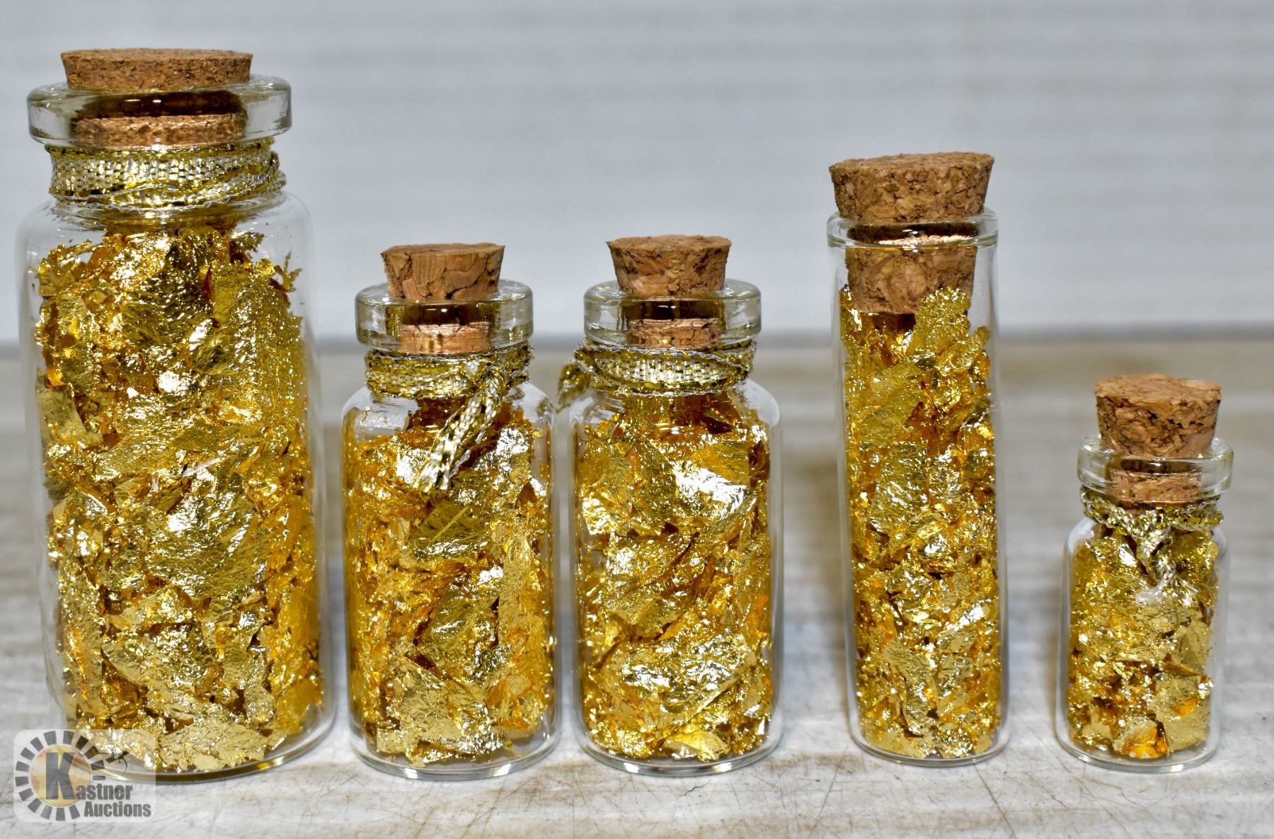 5 VARIOUS SIZE BOTTLES OF GOLD FOIL FLAKES