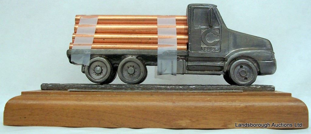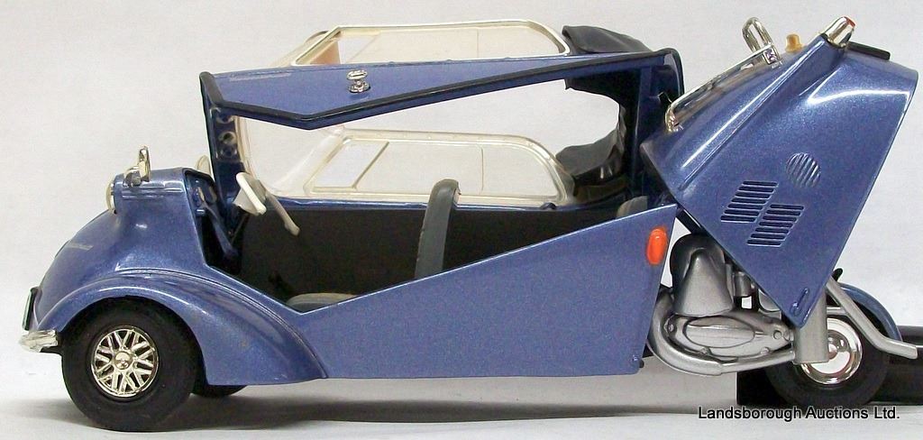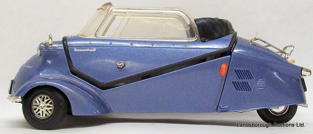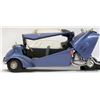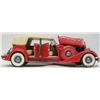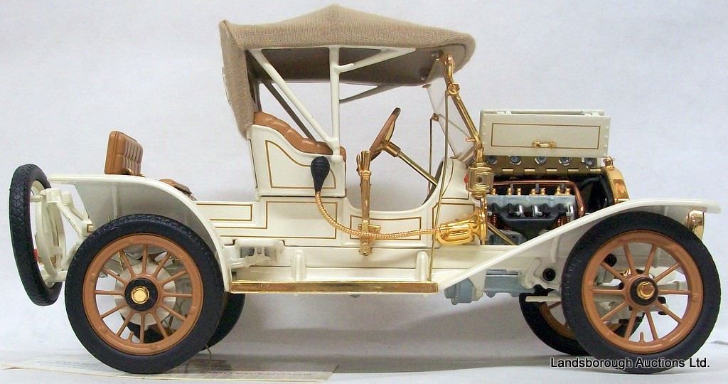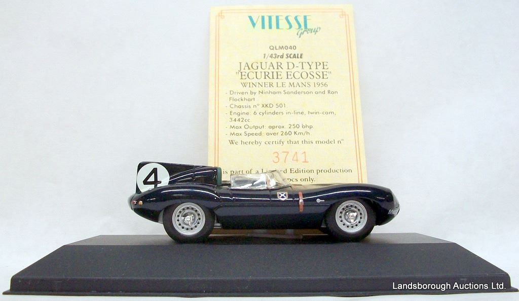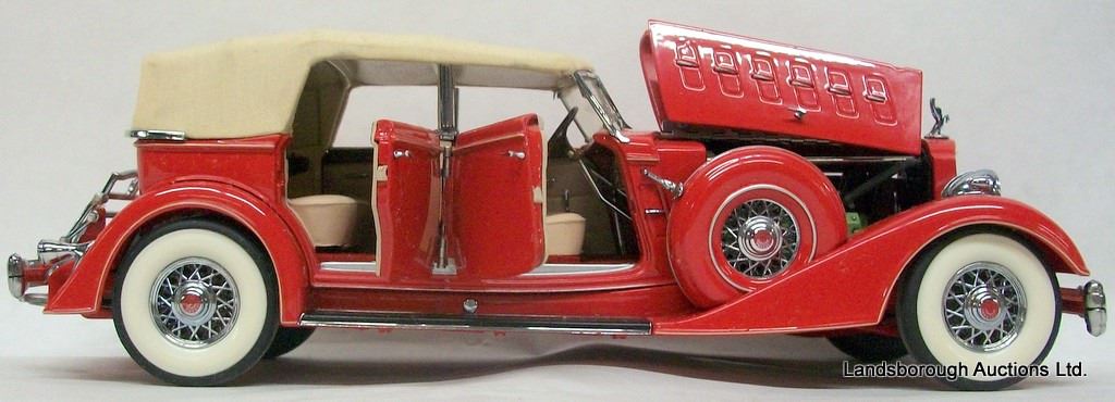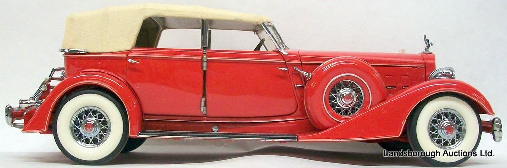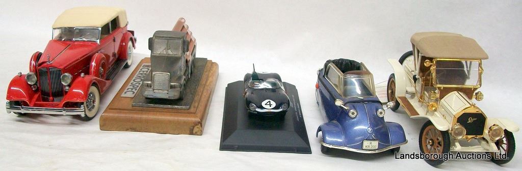 1910 WHITE CADILAC ROADSTER BY FRANKLIN MINT, PURPLE MESSERSCHWITT BY REVELL, JAGUAR D TYPE NUMBER 4 SANDERSON/ FLOCKHART, CERROSPEC PIPE TRUCK, 1934 RED PACKARD BY FRANKLIN MINT.