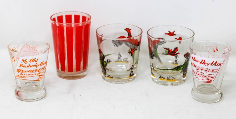 5 VINTAGE DRINK GLASSES - 2 PHEASANTS, 2 SONG
