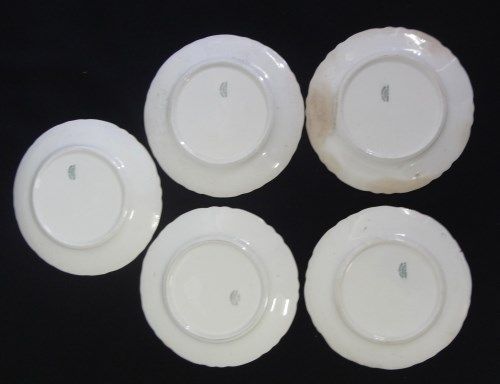 5 6" PLATES WITH FLOWER DESIGN AROUND RIM AND GOLD TRIM AROUND RIM. POPE GOSSER CHINA. MADE IN U.S.A.