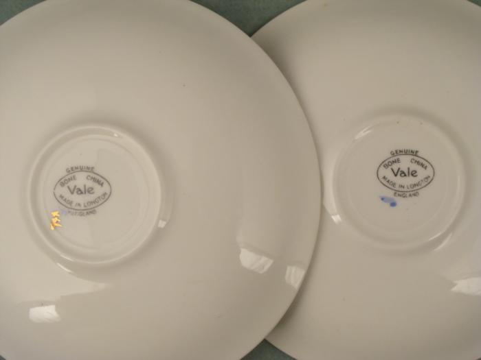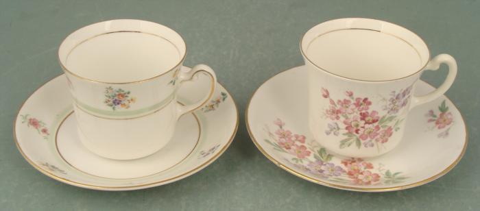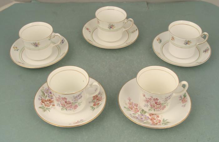 Here are 5 English teacup and saucer sets from Vale of Longton, England. They are all bone China, and date back 25 years or more. There is a set of 2, and a set of 3, all the same shape and size, the cups 3" in diameter. They have pretty flowers, and gold trim. All are in very good condition.
