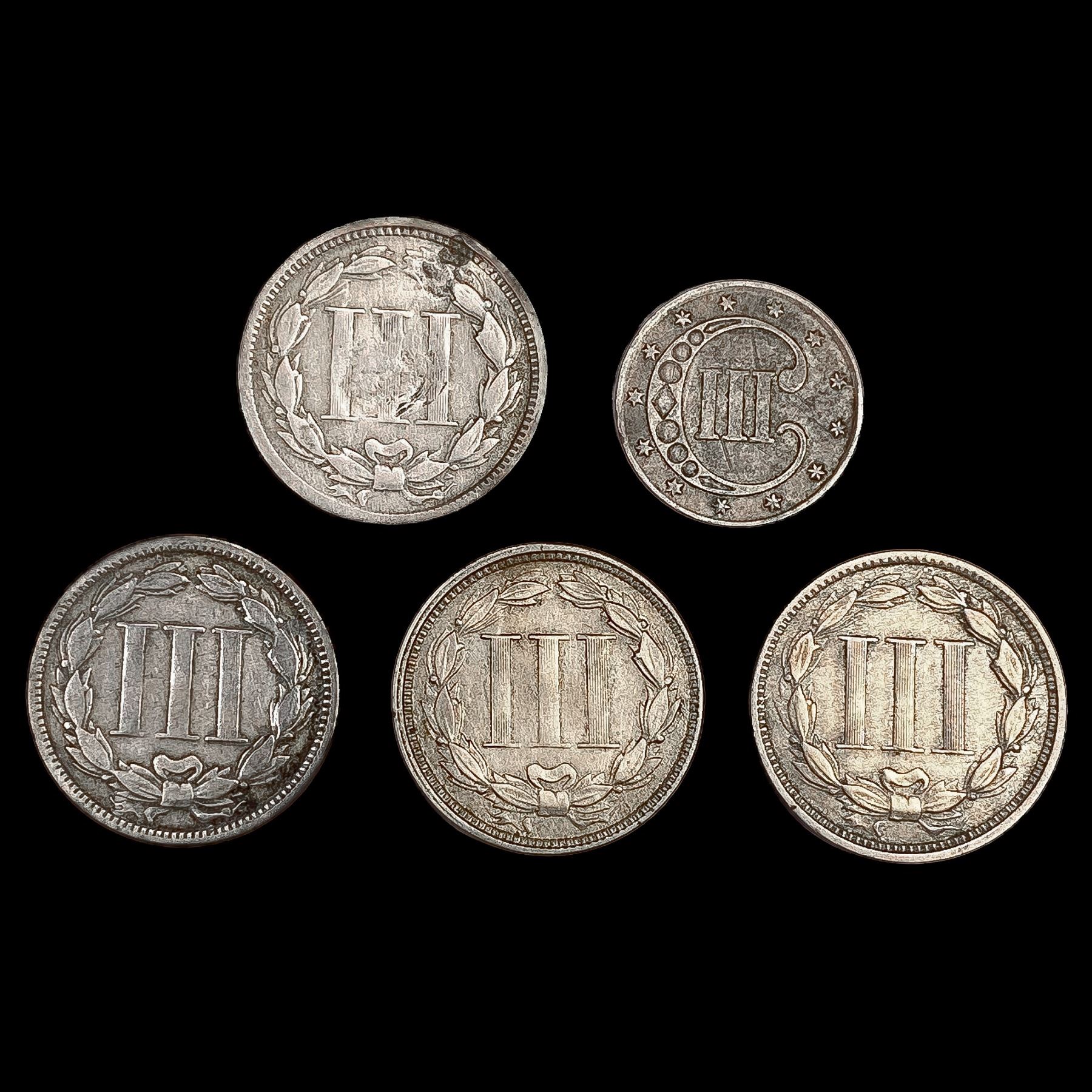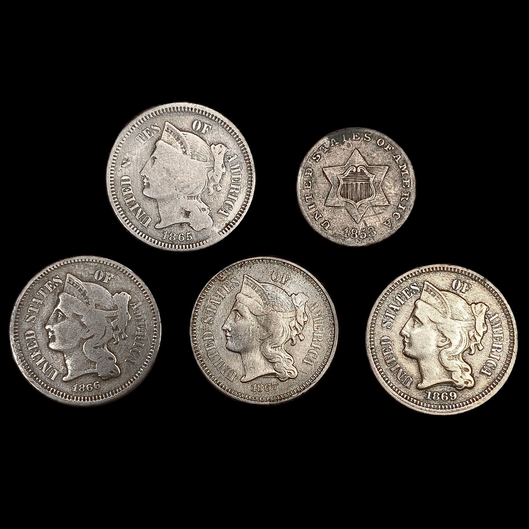 (5) Varied US 3 Cents (1853, 1865, 1866, 1867, 186