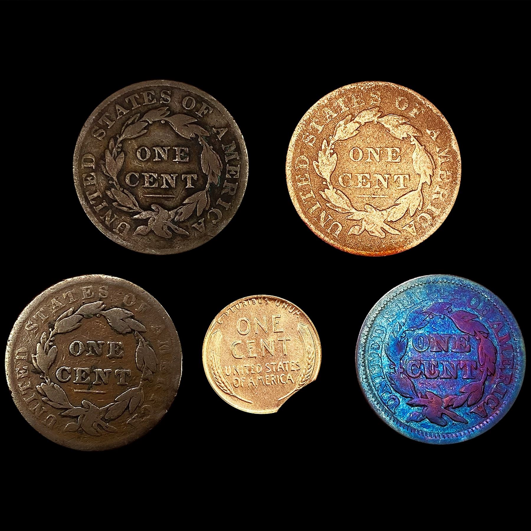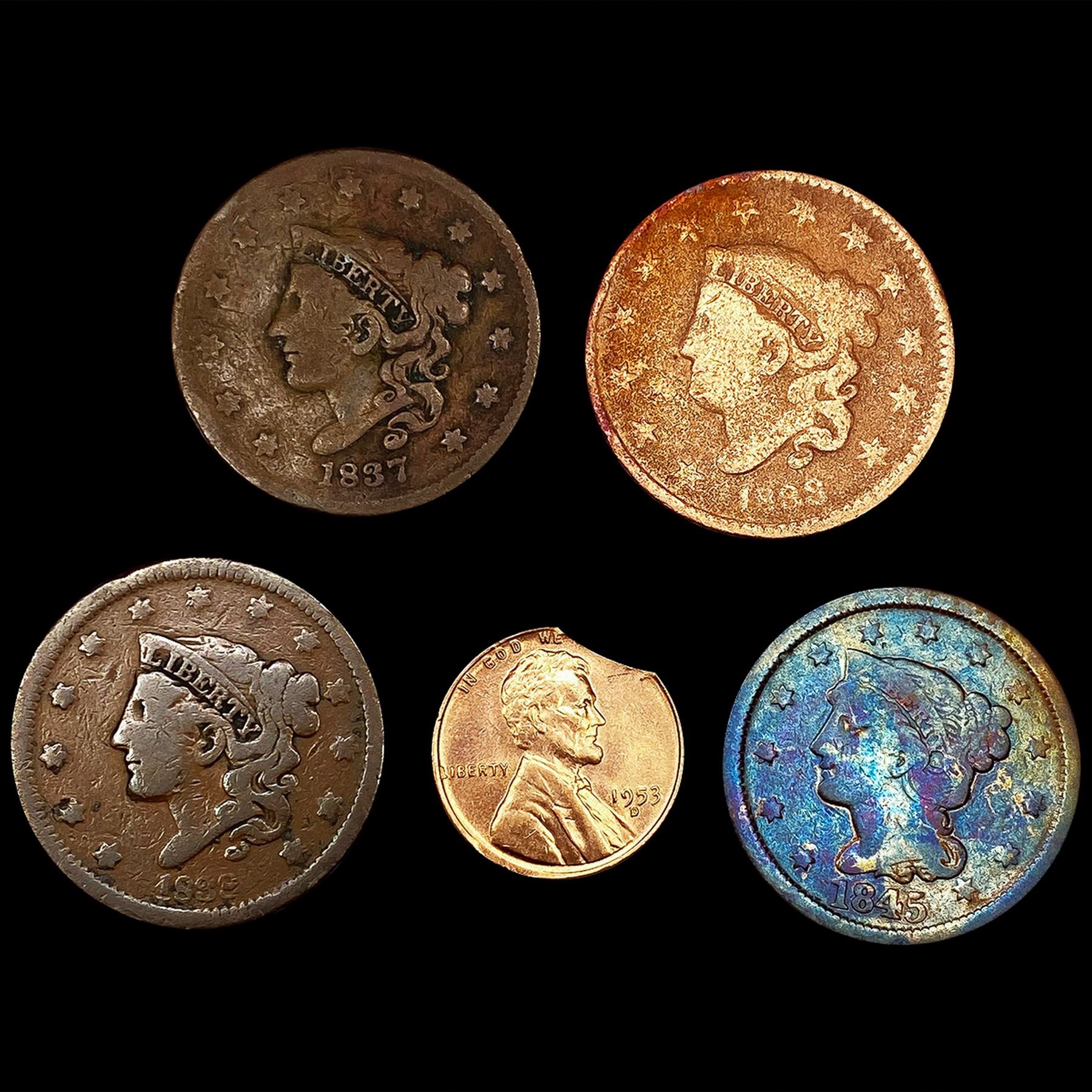 (5) Varied US Cents (1833, 1837, 1838, 1845, 1953-