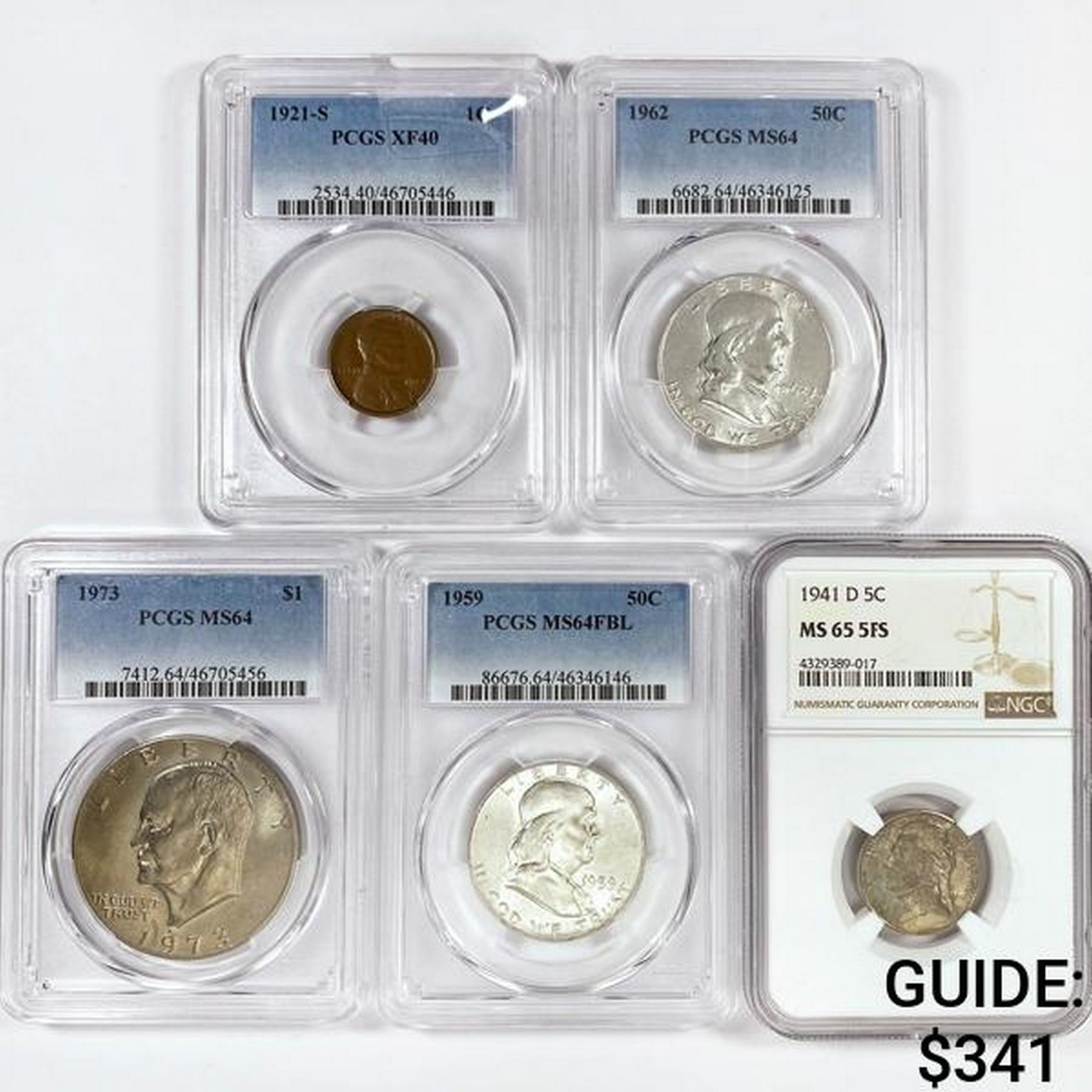 (5) Varied US Coinage PCGS,NGC 1921-1973