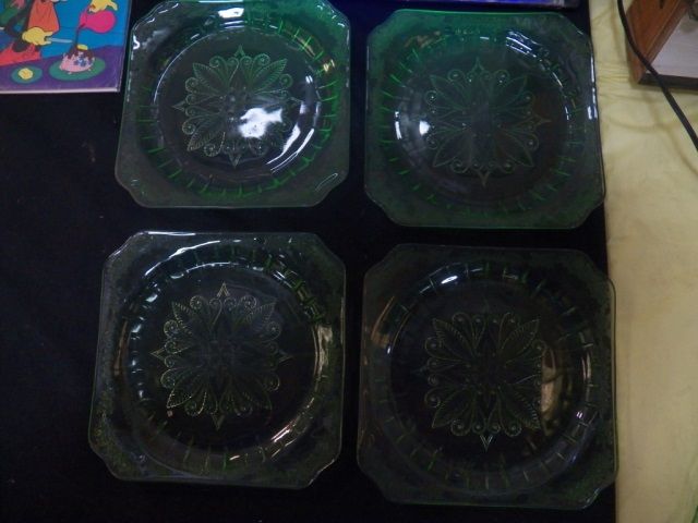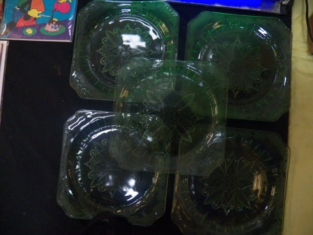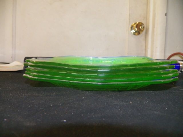 5-Green Glass Vaseline Dinner Plates approx 9"