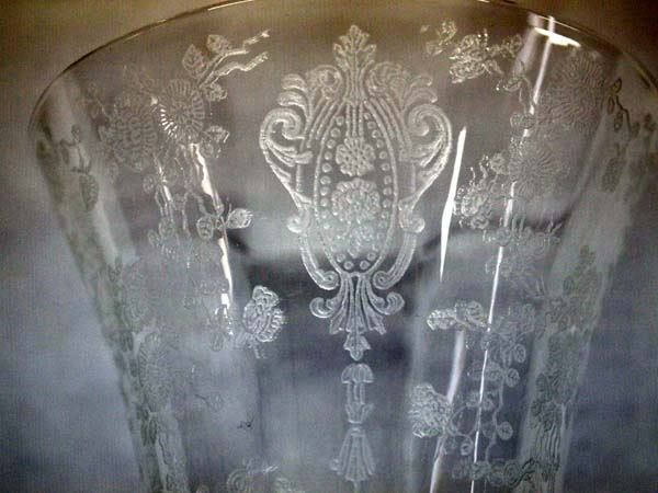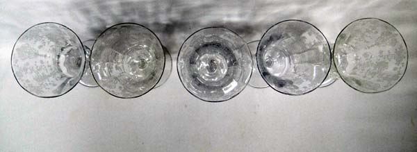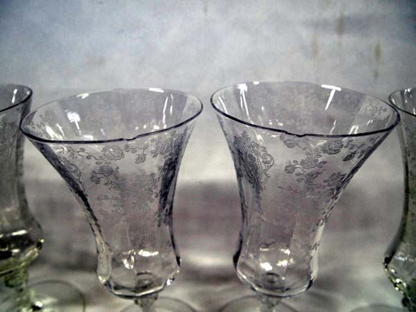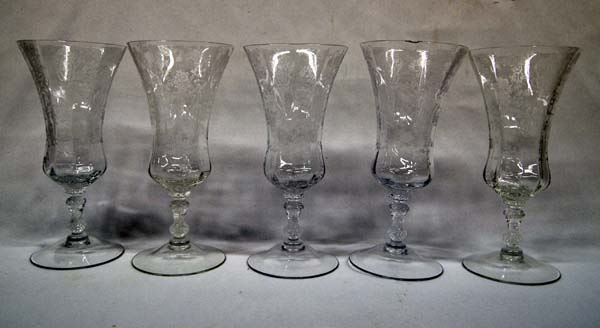 5 Vintage Cambridge Rose Point Ice Tea Goblets, clear etched, pattern #3500, 2 of the glasses have minor rim chips, measure 7 5/8'' Tall