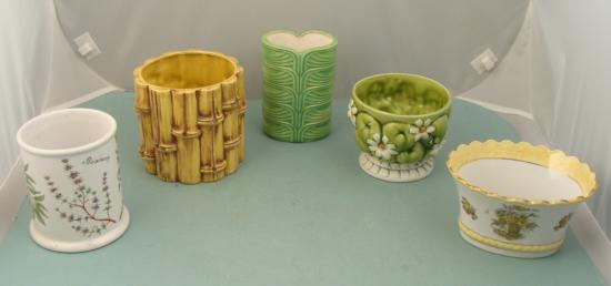 These are five ceramic containers, produced around 25 to 40 years ago. They'd be perfect for general storage, as planters, or just to display on their own. Their condition overall is excellent.