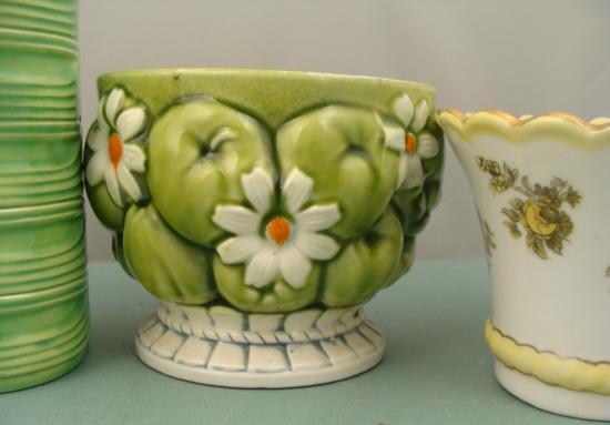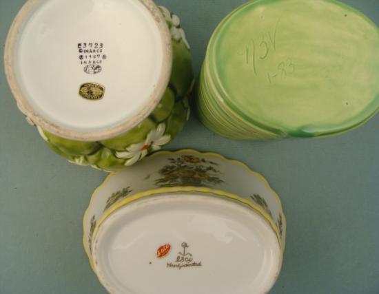 Bamboo design, 5 1/4" tall, 5 1/2" in diameter Inarco green white flower design, made in Japan in 1967, 4 1/2" tall, 5 1/2" in diameter (light crazing, needs cleaning) Tall green plant design, signed N3V 1-83, 6" tall, 4 1/4" wide Spice jar, with nice images, from Cooks Club, 5" tall, 4 1/4" in diameter Hand painted yellow oval container from Esco of Japan, 4" tall, 6 3/4" wide