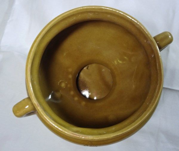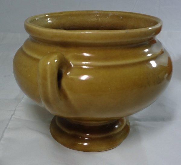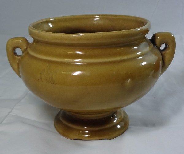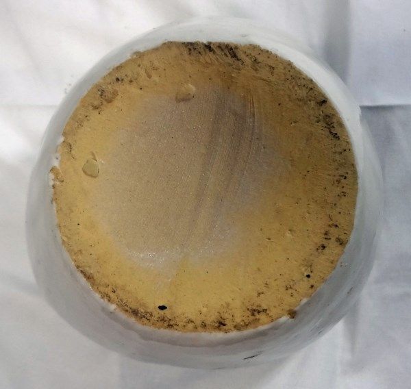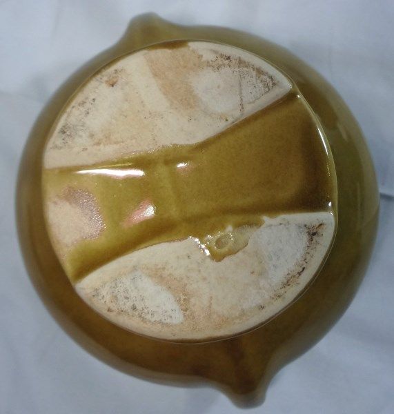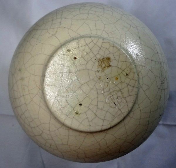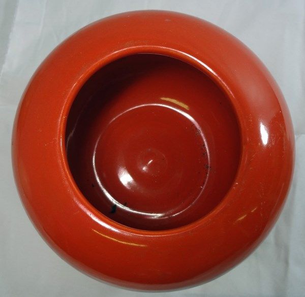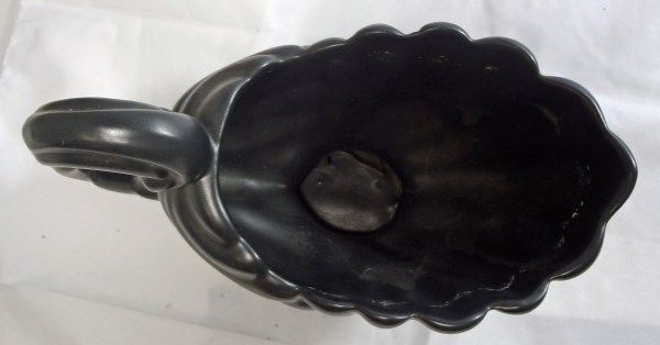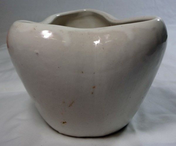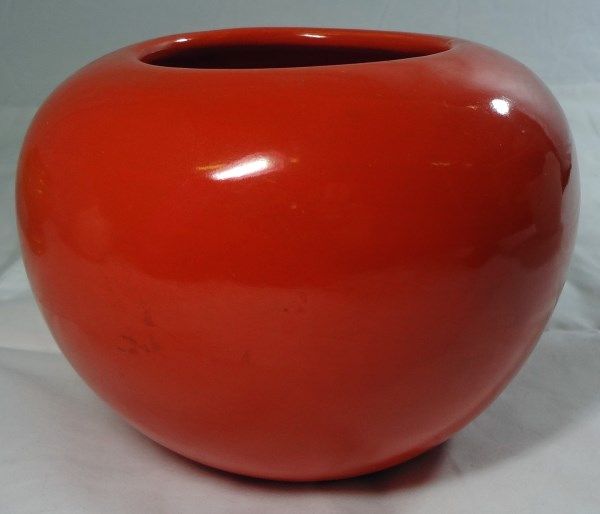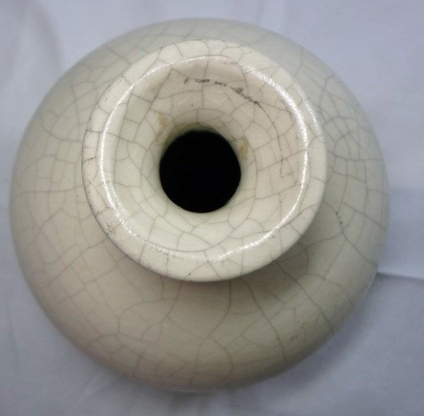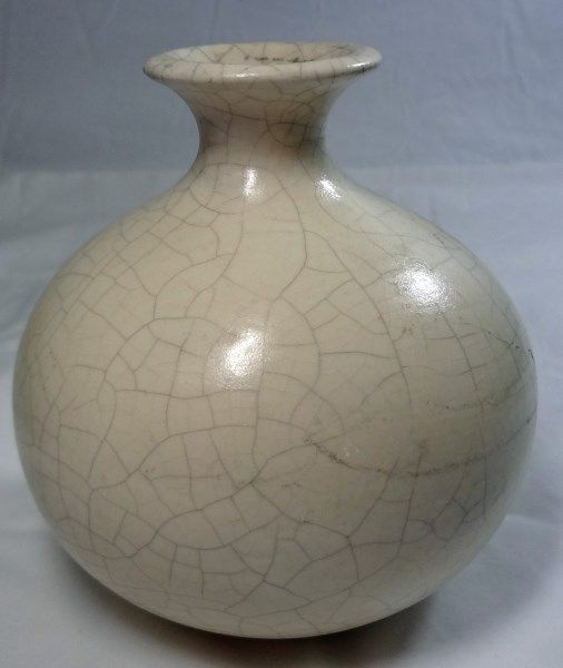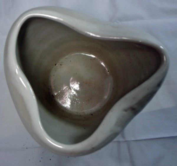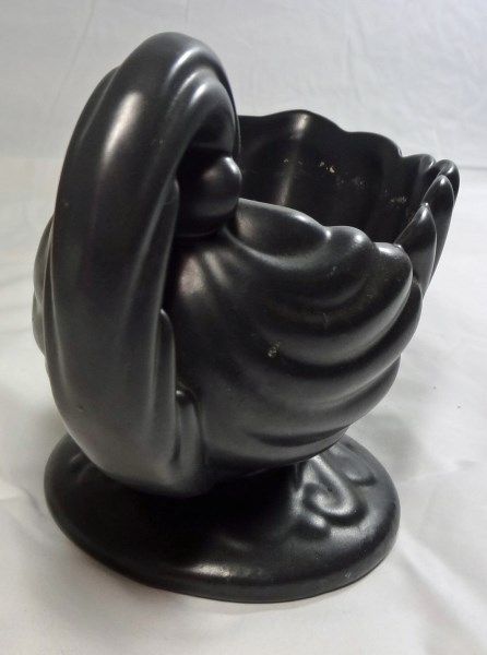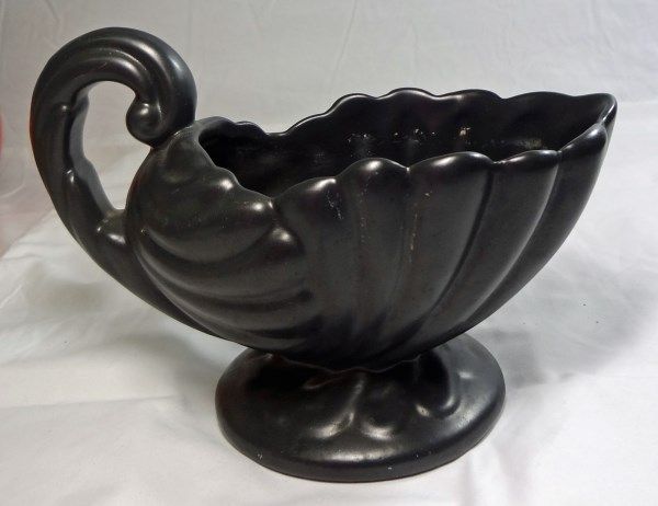 1 Orange high gloss, 1 brown/green, 1 black seashell, 1 white triangle shape, and 1 white crackle glaze vase.
