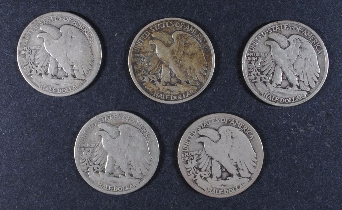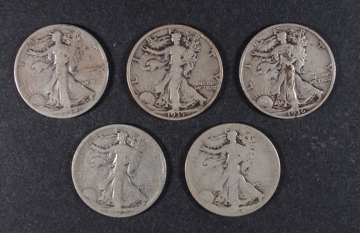 5 - WALKING LIBERTY HALF DOLLARS - 1923-S G, '34-D G, '34 VG, '35 FINE '36 FINE