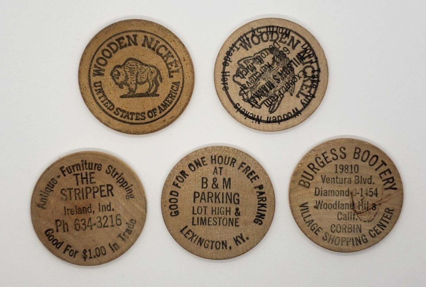 BURGERS BOOTERY WOODLAND HILL S CALIF; B&M PARKING LOT LEXINGTON KY; THE STRIPPER IRELAND IND.; WILSONS MARKET DETROIT MICH.; UNITED STATES OF AMERICA WOODEN NICKEL