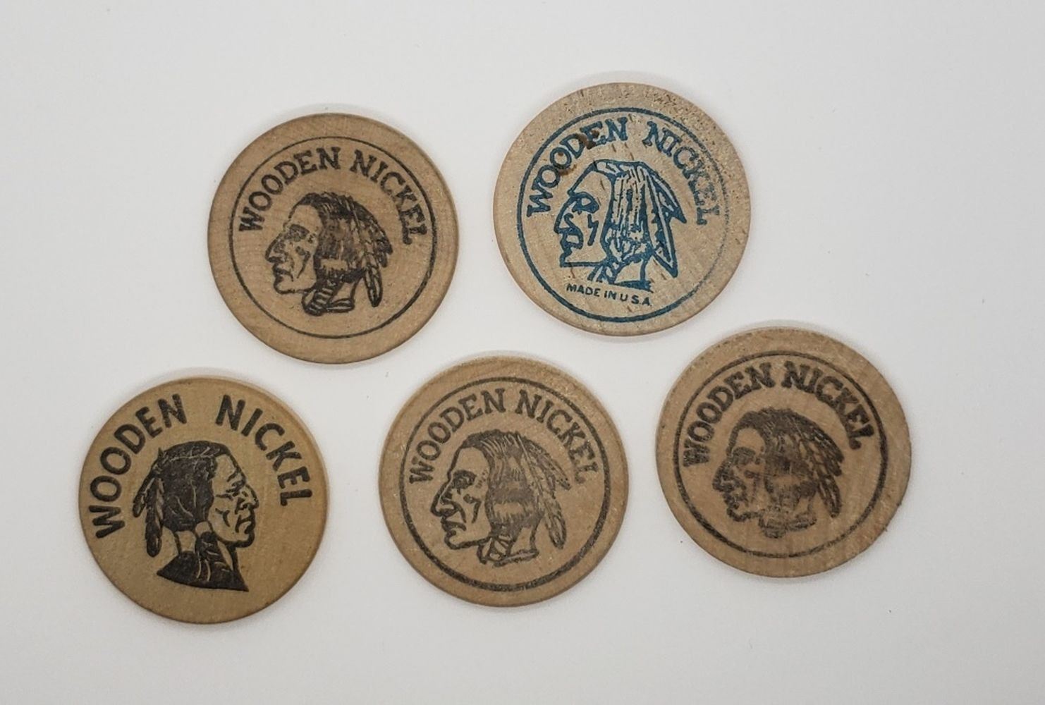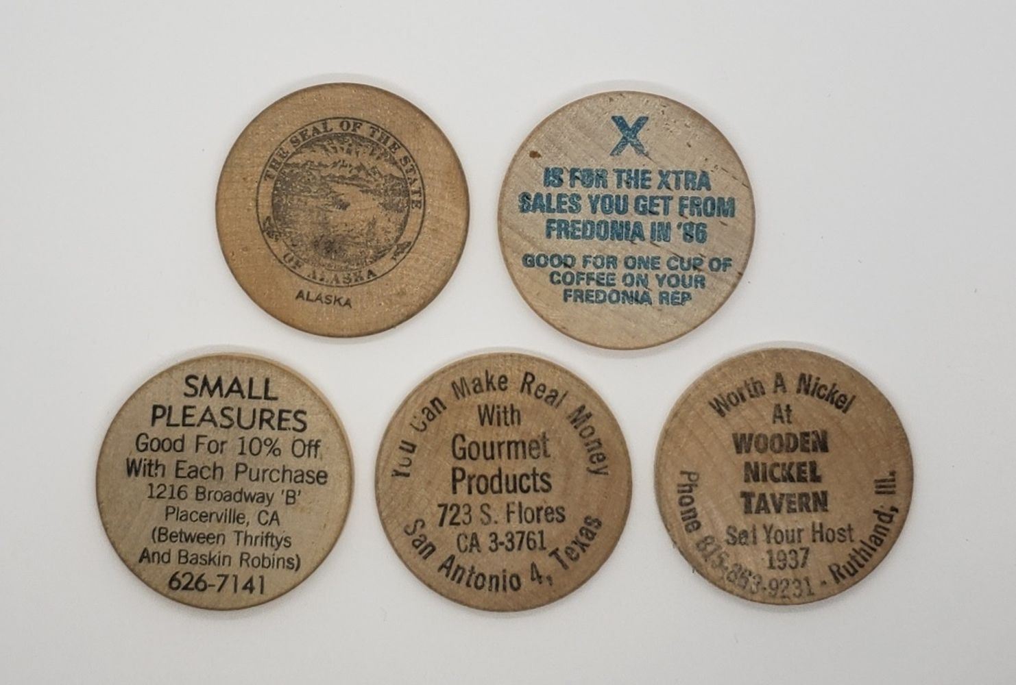 WOODEN NICKEL TAVERN SAL YOUR HOST 1937 RUTHLAND ILL.; ALASKA; SMALL PLEASURES PLACERVILLE CA; GOURMETN PRODUCTS SAN ANTONIA 4, TEXAS; FREDONIA IN '86'