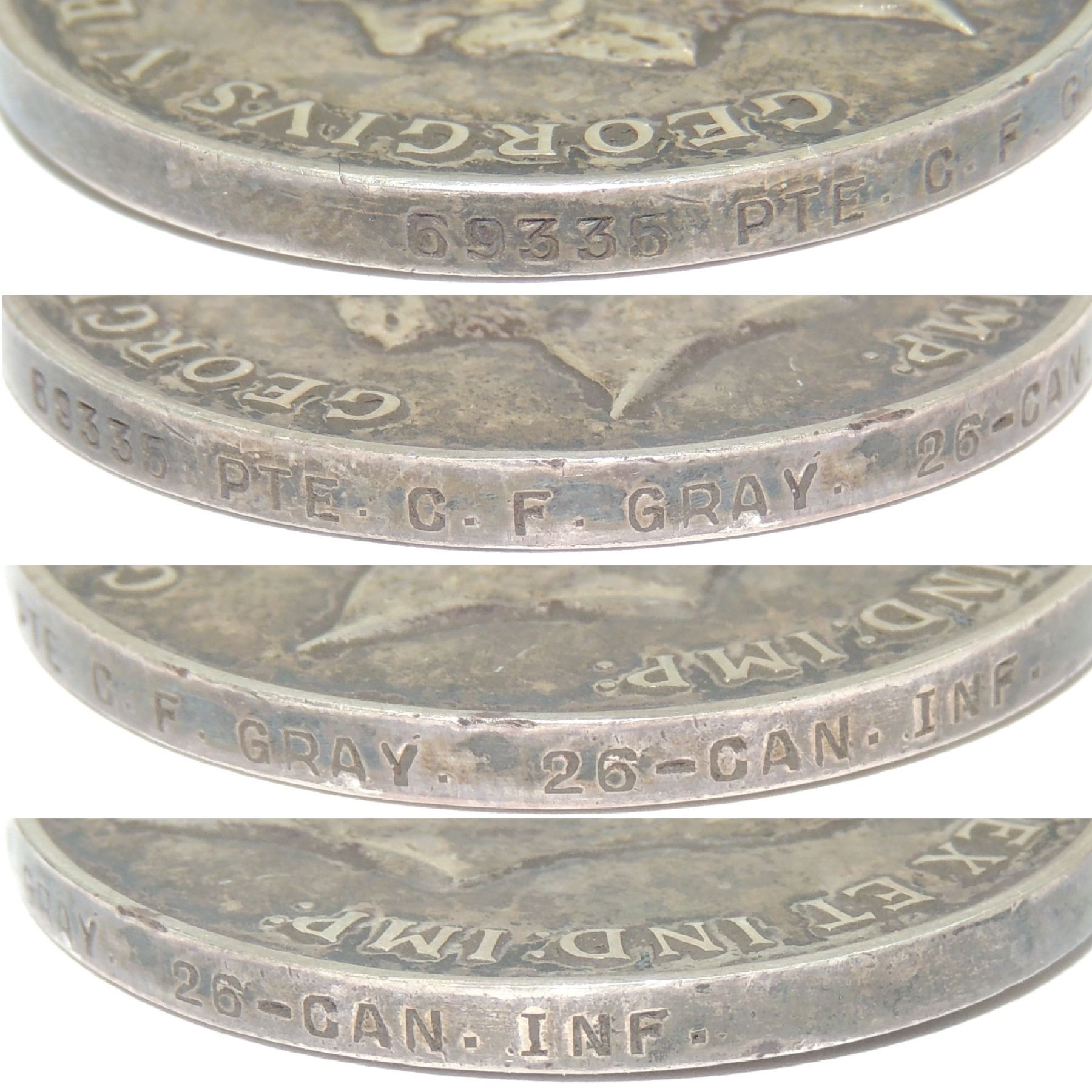 SILVER WW1 MEDAL NAMED TO "69335 PTE C.F. GRAY 26-CAN. INF" WORLD WAR ONE. ENLISTED NOVEMBER 25TH IN SAINT JOHN NEW BRUNSWICK.
