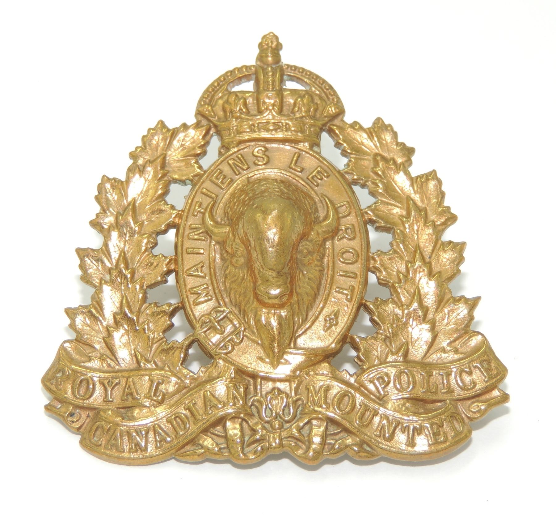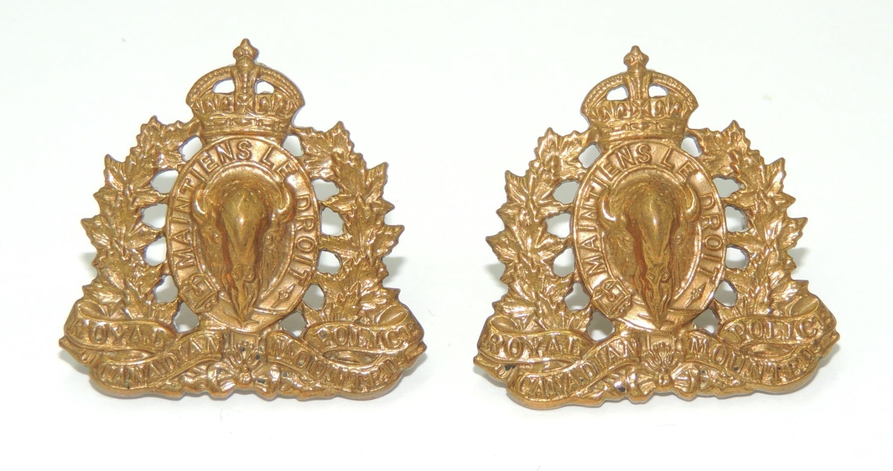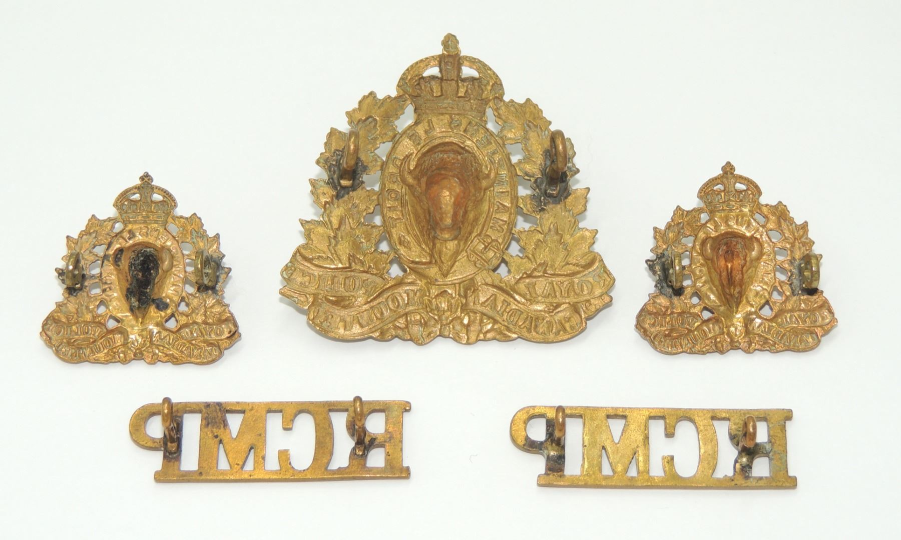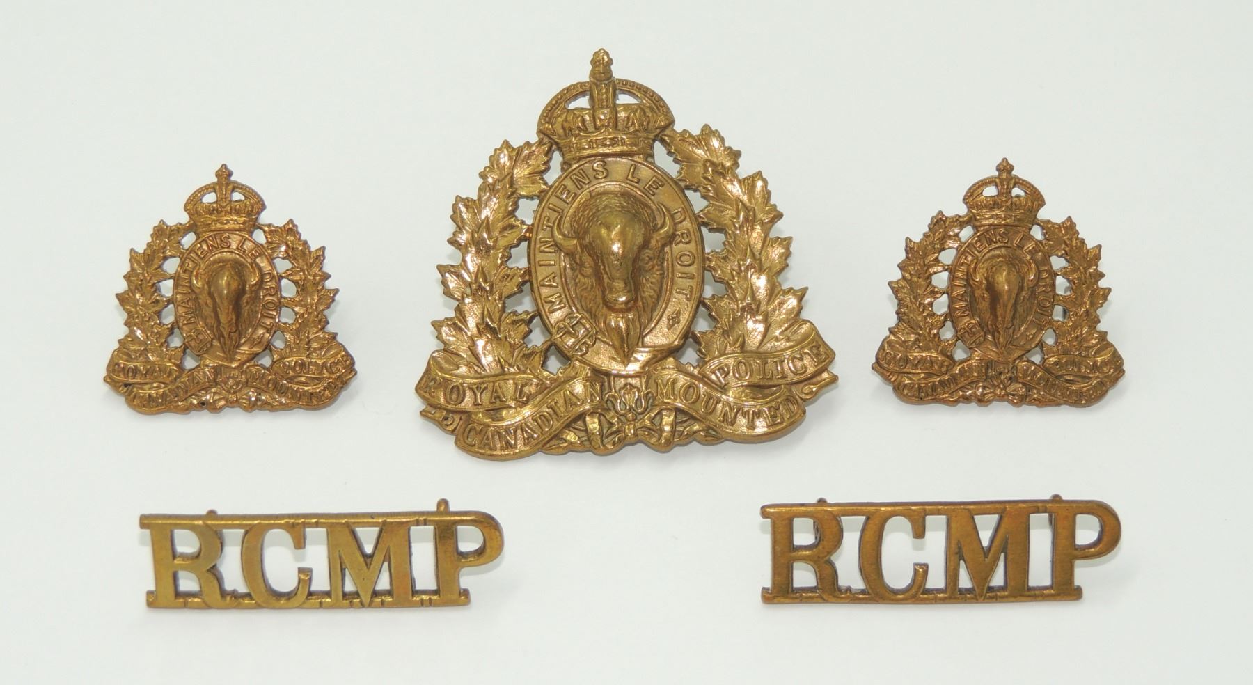 KINGS CROWN ROYAL CANADIAN MOUNTED POLICE SET , BADGE COLLARS AND SHOULDER TITLES UNMARKED - WORLD WAR TWO ERA RCMP 1930'S 1940'S CAP BADGE SET FOR VISOR CAP VINTAGE POLICE LAW ENFORCEMENT CAP BADGE INSIGNIA MOUNTIE