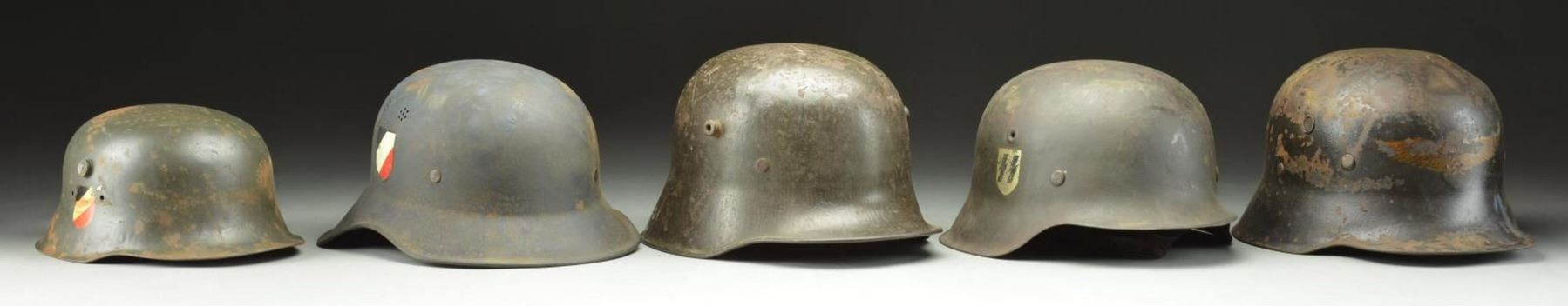 1) AUSTRIAN. A WWII reissued Austrian screened vent helmet. Helmet has a black painted finish with a Luftschutz decal on the front. There is no liner or chinstrap but a partial band is present. CONDITION: helmet body has dents. Painted finish is about 50%. Decal is about 60%. Partial band shows heavy wear. 2) GERMAN. A WWII period M1942 SS helmet with embossed vent & raw edge. There is a single SS rune decal on the right side that, in our opinion, was added after the war. Interior rear of helmet is stamped "KL68" & "3911". Full brown leather liner & black leather chinstrap. A fine original M42 combat helmet that was enhanced after the war with an SS decal. CONDITION: helmet finish is approx. 85%. Decal is about 85%. Liner & chinstrap are complete but show light to moderate wear. 3) GERMAN. A WWI period M1918 helmet. Helmet has a dark green painted finish overall. White 3 pad liner that may be a replacement & a black chinstrap. CONDITION: helmet finish is approx. 70%. Liner is a bit dirty but undamaged. Chinstrap is worn & moldy. 4) GERMAN. An early, 1 piece, gladiator style Luftschutz helmet with a very dark greenish blue painted finish. There is a Reichsbahn decal on the left side & a national colors decal on the right. The Reichsbahn decal looks a bit too fresh & may be a post WWII addition. Rubberized canvas 9 tongue liner with plastic chinstrap. CONDITION: helmet finish is approx. 85%. Reichsbahn decal is nearly 100%. National colors decal is about 93%. Liner shows moderate wear. Chinstrap shows moderate wear with some degradation to the plastic. 5) GERMAN. An interesting child's helmet. Helmet is made in the shape of a Stahlhelm helmet. It has a green painted finish with a Wehrmacht decal on the left & a national colors decal on the right. There is no remaining chinstrap or liner. CONDITION: helmet finish is approx. 80%. There are some minor shallow dents to the helmet. Wehrmacht decal is 70%. National colors decal is 90%. (02-17120/BF). $1,000-1,400.