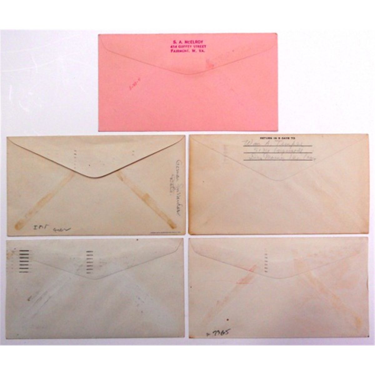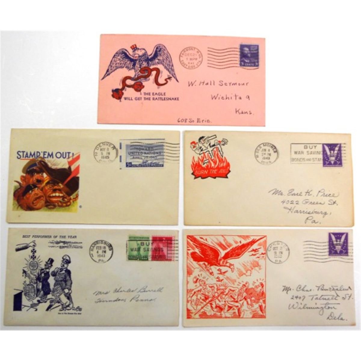 Here are five envelopes mailed during WWII, post marked from five different cities. They all have different anti-axis slogans on them that serve as a reminder of our country's patriotism of the past. They're in excellent condition. Measures 6 1/2" x 3 1/2".