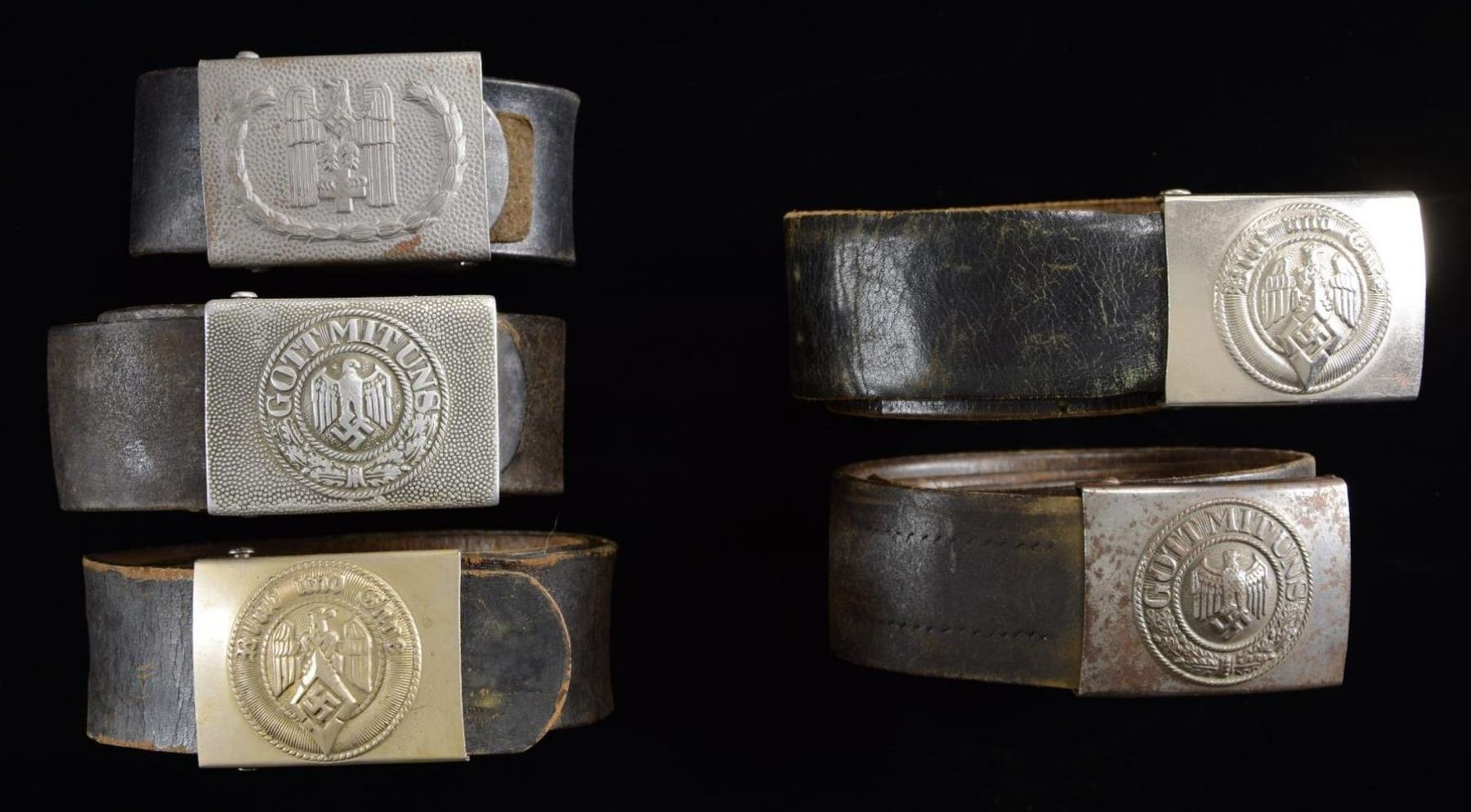 This belt lot consists of 1 army belt buckle in aluminum and a leather belt with an aluminum keeper. / 1 Army belt buckle in steel and a leather belt with aluminum keeper. / 2 HJ belt buckles in steel and leather belts with steel keepers. / 1 Red Cross belt buckle in plated steel and a leather belt with a steel keeper. CONDITION: all buckles show light overall wear. Belts are complete and show some wear but are undamaged. (02-22397/BF). $450-650.