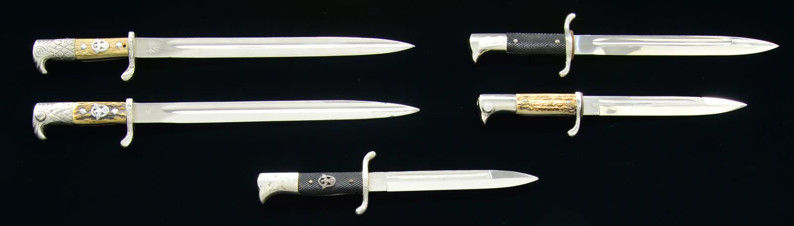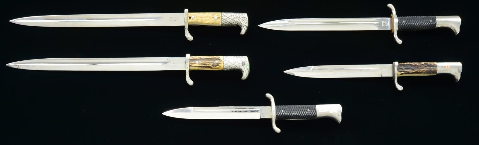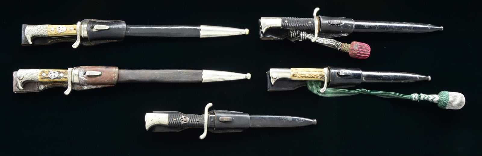 1) POLICE. Overall length 18 1/8". Blade is marked “A C (scale) S” on one side and “ALEXANDER COPPEL (logo) SOLINGEN” on the other. The plated cross guard is embellished with oak leaves and stamped “S. Op. I. 645.”. Plated eagle effigy pommel. 2 Piece stag grips with police insignia in the center of one grip. There is an extra set of holes under the bottom ribbon. Black leather scabbard with plated mounts and black leather frog dated 1939. CONDITION: blade shows original factory polish. The hilt, scabbard & frog show light overall wear. 2) POLICE. Overall length 19 1/2". Blade is marked “(knights head)” on one side and “WEYERSBERG KIRSCHBAUM & CIE SOLINGEN” on the other. The plated cross guard is embellished with oak leaves and stamped “S. B. 12874.”. Plated eagle effigy pommel. 2 Piece stag grips with police insignia in the center of one grip. Brown leather scabbard with plated mounts and brown leather frog dated 1938. CONDITION: blade shows scabbard wear, particularly near the tip. Hilt shows light wear. Scabbard & frog show moderate wear. 3) FIRE POLICE. Overall length 14 1/8". Blade is marked “(knights head) WKC”. S shaped plated guard with plated bird like pommel. 2 Piece black composite grips with police insignia in the center. Black enameled metal scabbard with black leather frog. CONDITION: blade shows original factory polish with some minor scabbard wear. Pommel has some minor bubbling to the finish. Bayonet & frog show light wear. 4) POLICE. Overall length 13 7/8". Blade is marked “ORIGINAL (squirrel) EICKHORN SOLINGEN”. Plated cross guard & bird like pommel. 2 Piece stag grips. Black enameled metal scabbard with black leather frog having a green & silver knot attached. CONDITION: blade shows some scabbard wear. Hilt, scabbard, frog, & knot show light wear. 5) FIREMAN. Overall length 15". Blade is marked “ORIGINAL (squirrel) EICKHORN SOLINGEN”. Plated S shaped cross guard with plated bird like pommel. 2 Piece black composite grips. Black enameled metal scabbard with black frog having a black, silver & red knot attached. CONDITION: blade shows original factory polish with scabbard wear particularly near the tip. Grip shows might wear. Scabbard, frog & knot show light to moderate wear. PROVENANCE: From the Lifelong Collection of Glen E. Mattox. (02-18320/BF). $1,500-2,000.