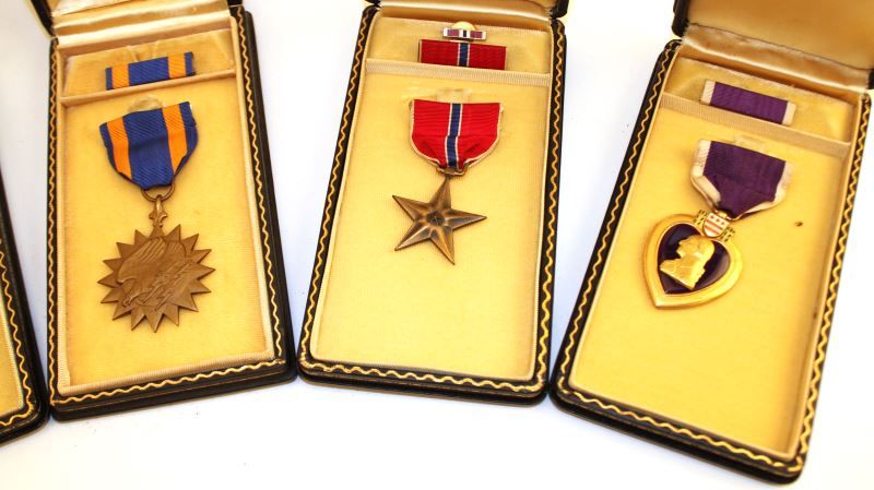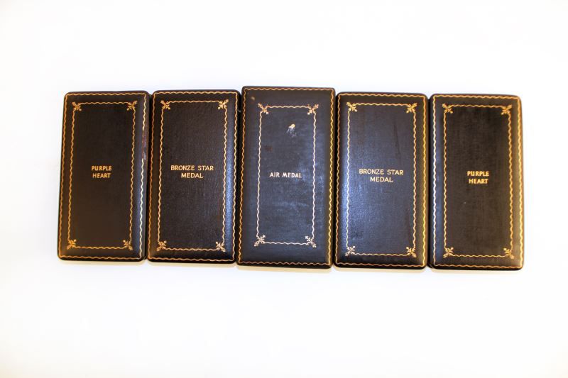 This group includes two cased Bronze Stars complete with medals, ribbon bars, lapel pins, and are in early display cases, two Purple Hearts both with ribbon bars and are in early cases, and one United States Army Air Force Air Medal with ribbon bar in early case. All medals and cases are in good to very good condition.