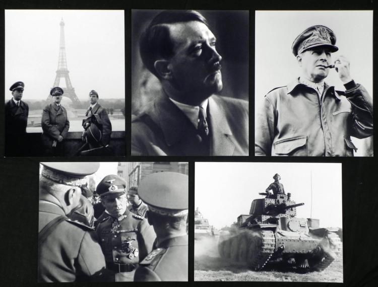 These 5 photographs all portray unforgettable scenes and figures from WWII. * * These are 8 x 10 black & white glossy high quality archive reprints. All are in excellent condition. * * * They feature: * * Hitler portrait Hitler visiting Paris with Albert Speer (left) and artist Arno Breker Erwin Rommel Erwin Rommel in Panzer tank General MacArthur with pipe