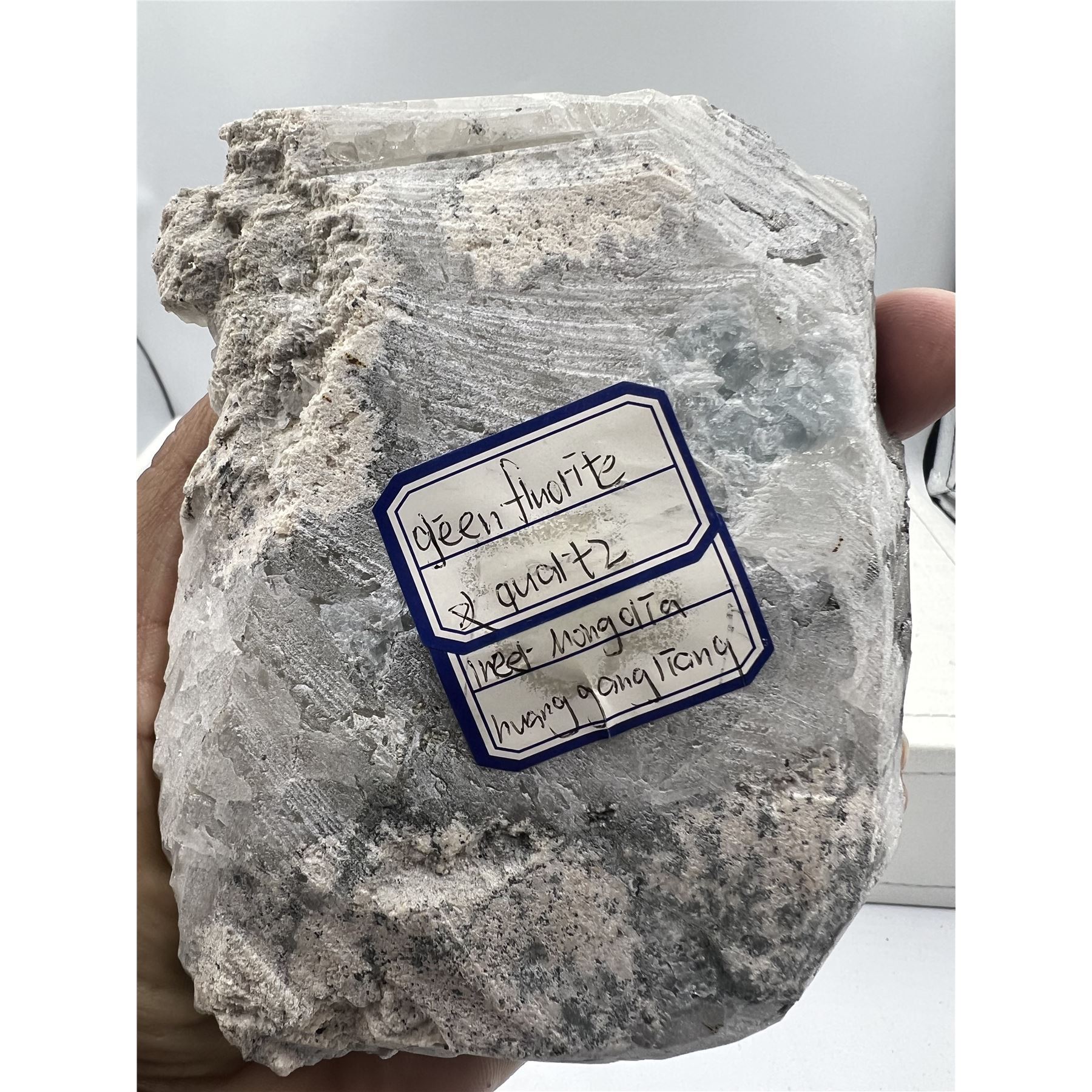 5 X 3 INCH GREEN FLUORITE WITH CALCITE SPECIMEN ON STAND