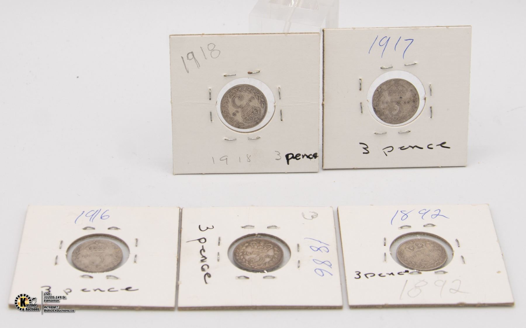 5 X 3 PENCE SILVER COINS 1892, 1886, 1916, 1917, &
