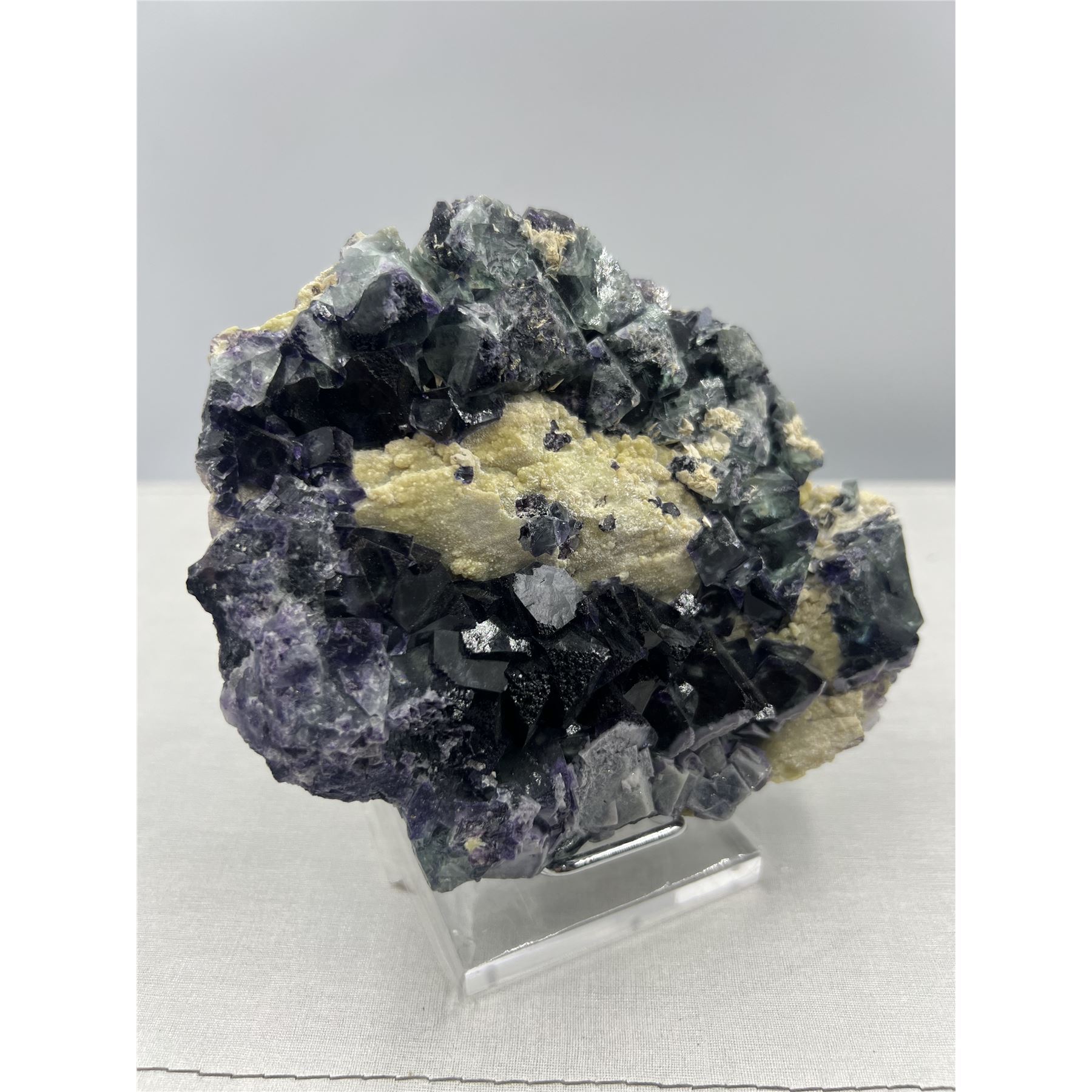 5 X 7 1/2 INCH RARE PURPLE AND GREEN FLUORITE SPECIMEN ON STAND