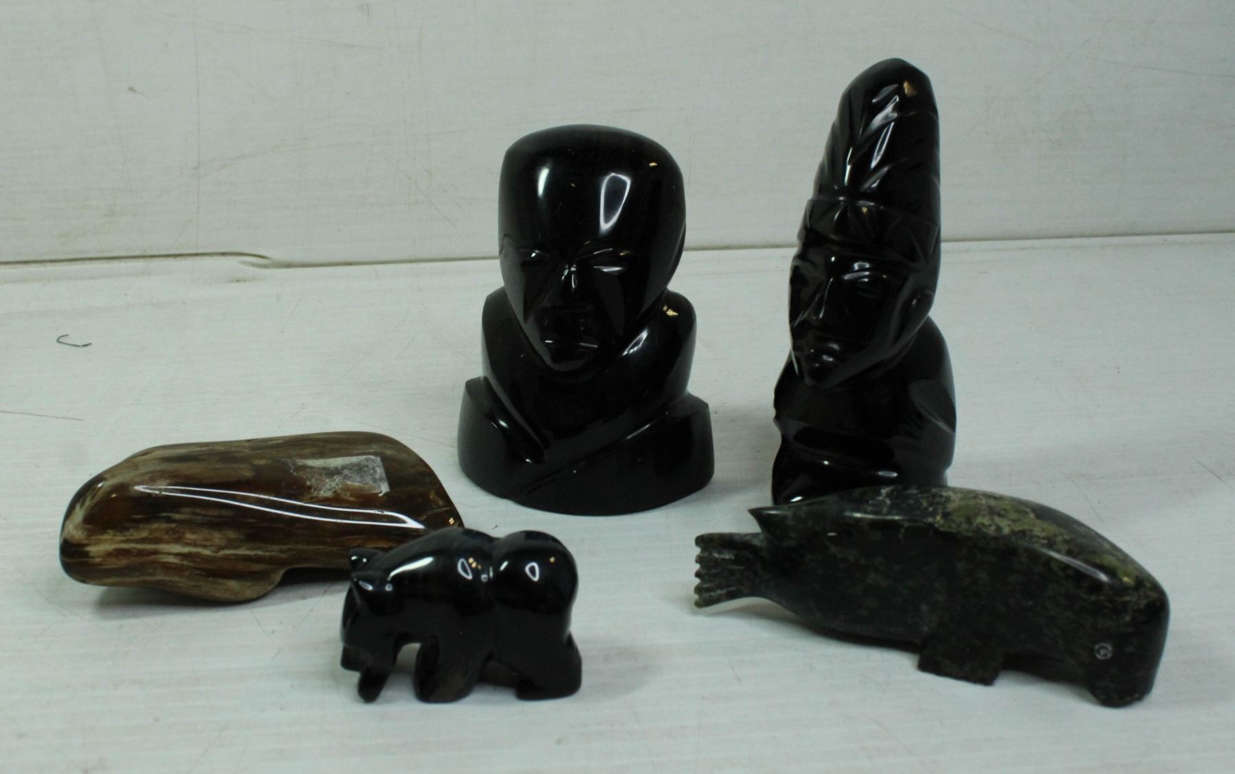 5 X SOAPSTONE & MARBLE CARVED FIGURES SIGNED