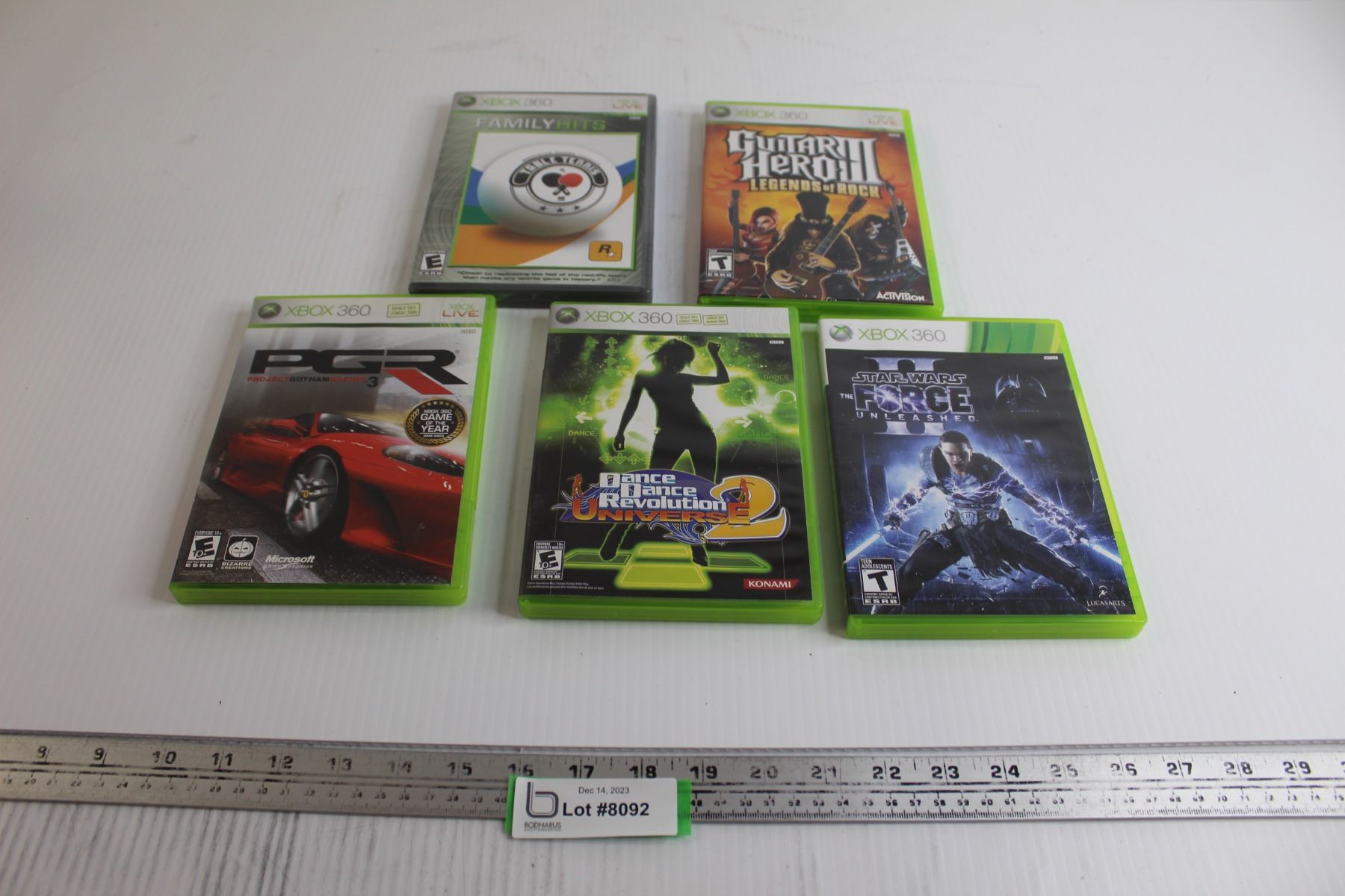 (5) Xbox 360 Games - Guitar Hero III, Dance Dance Revolution Universe 2, Star Wars Force Unleashed