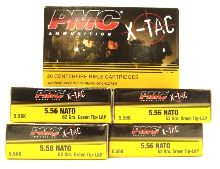 5 boxes of PMC 5.56 X-TAC 62 Grain Green Tip Ammo. Core penetrator Boat tail Ammo. 20 rounds per box EST $70-$80