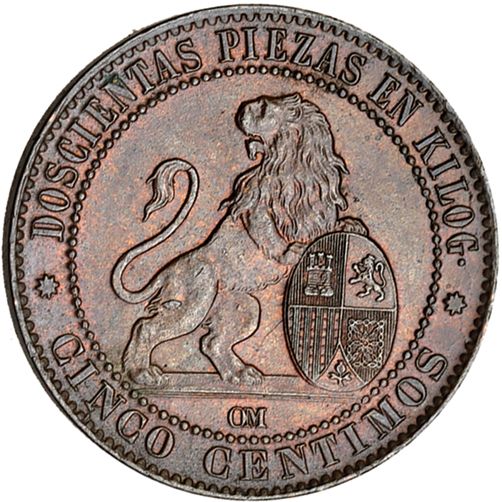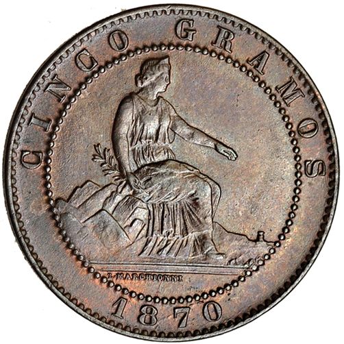 5 céntimos. 1870. Barcelona. OM. VII-3. R.B.O. EBC.