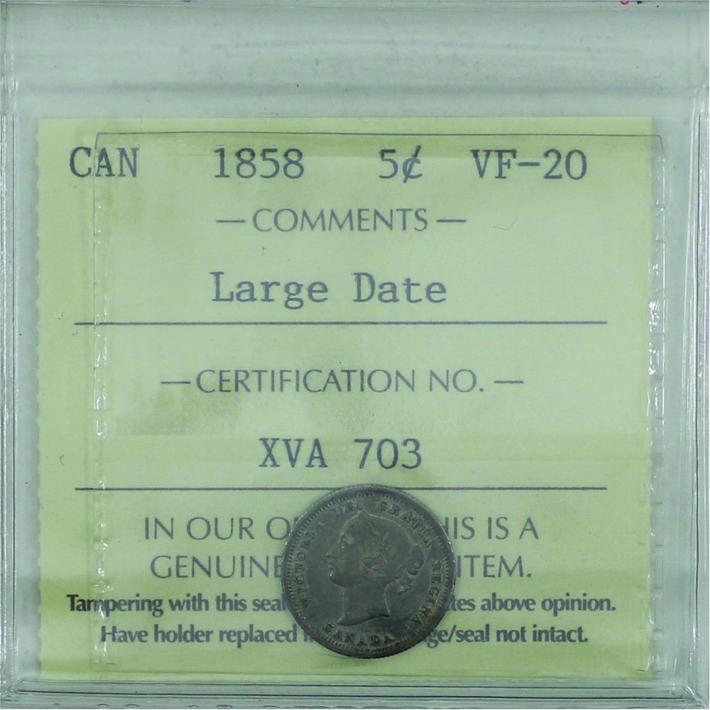 5-cent 1858; Large Date ICCS certified VF-20. Light to medium even toning thoughout.